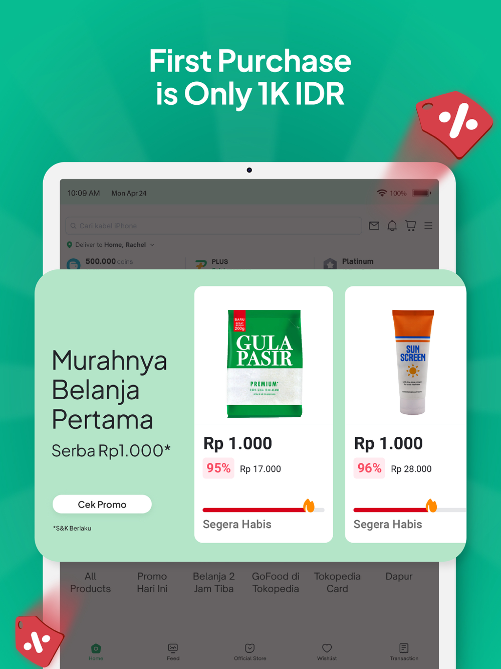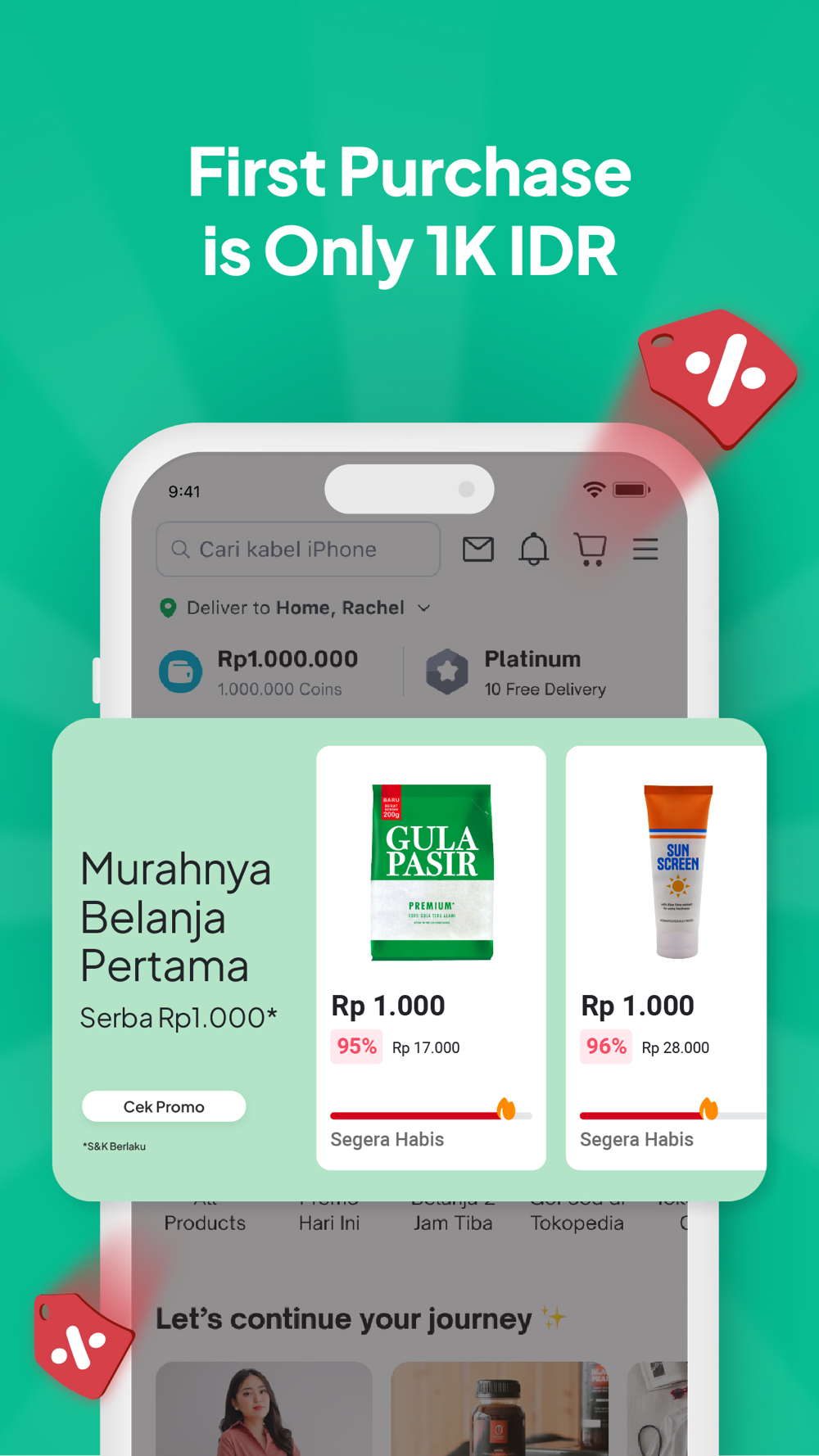 With only 1.000 IDR you’re able to checkout your first purchase in Tokopedia thanks to Traktiran Pengguna Baru! What are you waiting for? Download now!