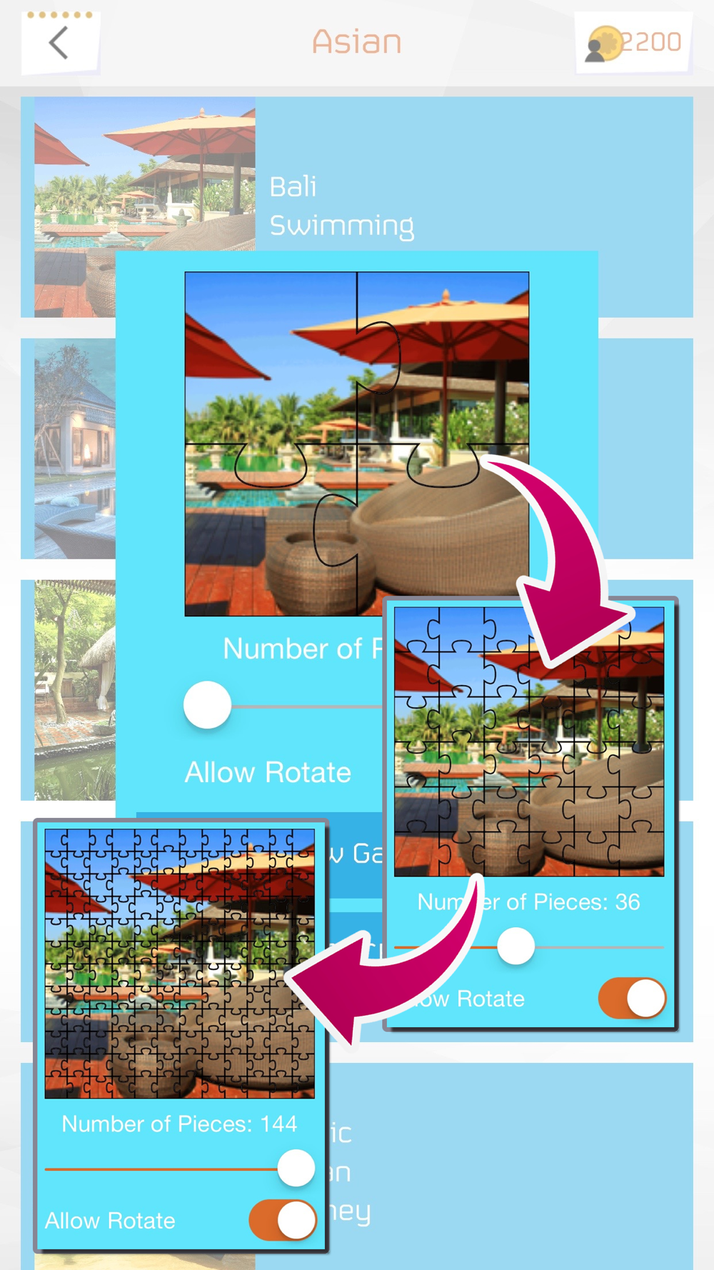 You can freely adjust the difficulties by setting number of pieces or rotation of pieces.