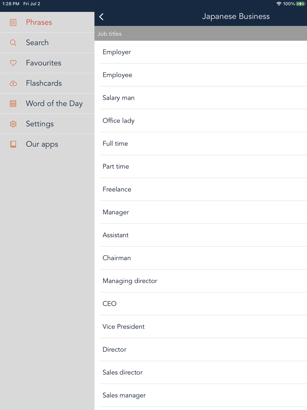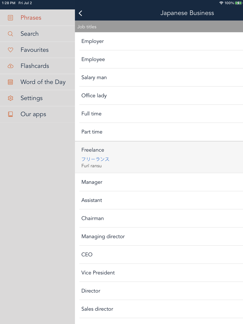 Japanese Business is free to download and comes with 200 useful phrases you can learn right away. If you find the app useful you can upgrade via in app purchase to access over 1000 phrases carefully categorised into 19 business topics. Each phrase professionally translated and recorded by native Japanese speakers.