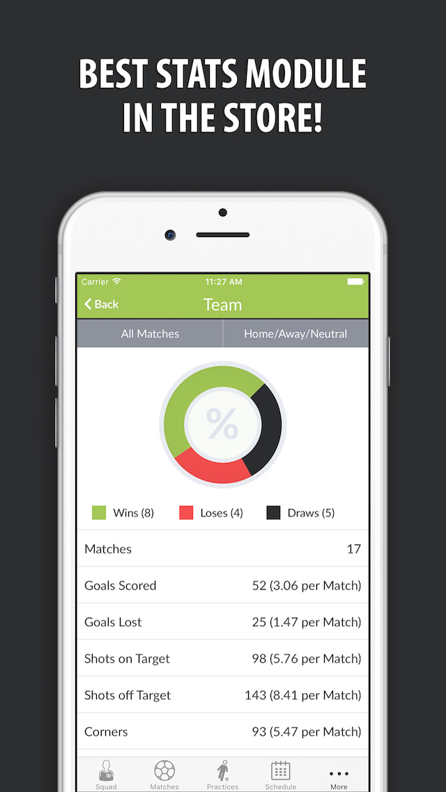 - ”MATCH MODE” (complex mode): set lineup, subs bench, tactic and log EACH match event: goals, assists, substitutions, cards, etc. (25 preset event types and the ability to extend the list and add your own events). You can also add match notes at the end to evaluate players