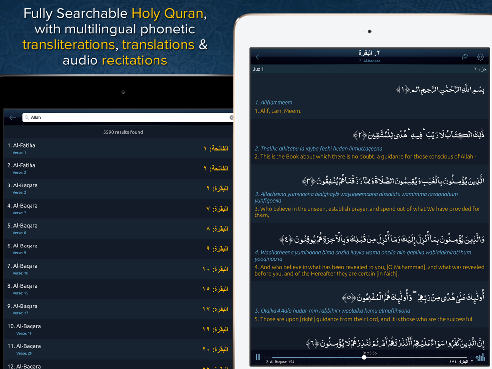 - Fully searchable Quran, allowing you to search for any text in the Arabic Quran, Transliteration, Translation or Surah name. You can also Bookmark, Share, Annotate or Copy any verse