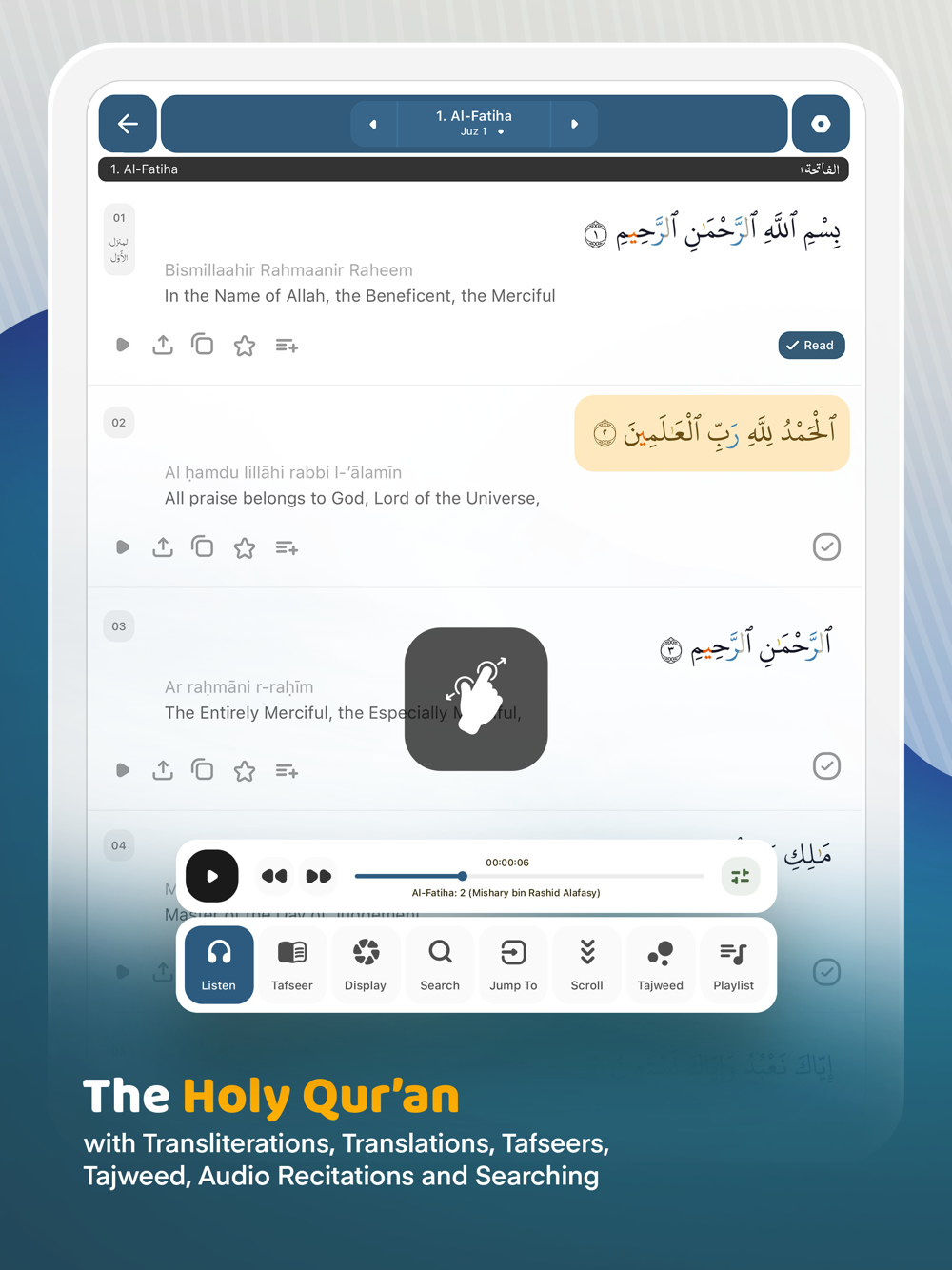 - 'Follow Reciter' feature to listen to the Quranic recitation followed by the Translation recitation.