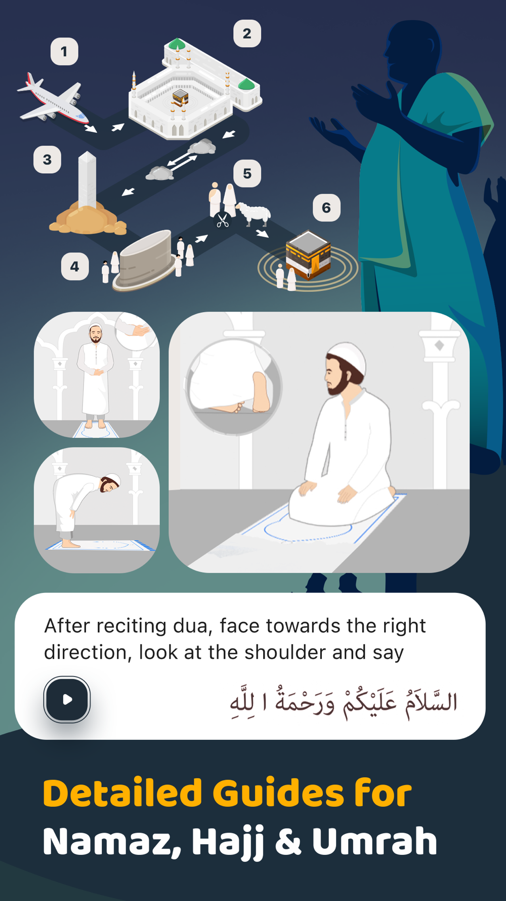 - 'Salah Guide' section, containing detailed guidance with pictorial illustrations & audio recordings for offering the Salah / Prayer. Very useful for kids, new converts to Islam, or anyone looking to perfect their Namaz knowledge.