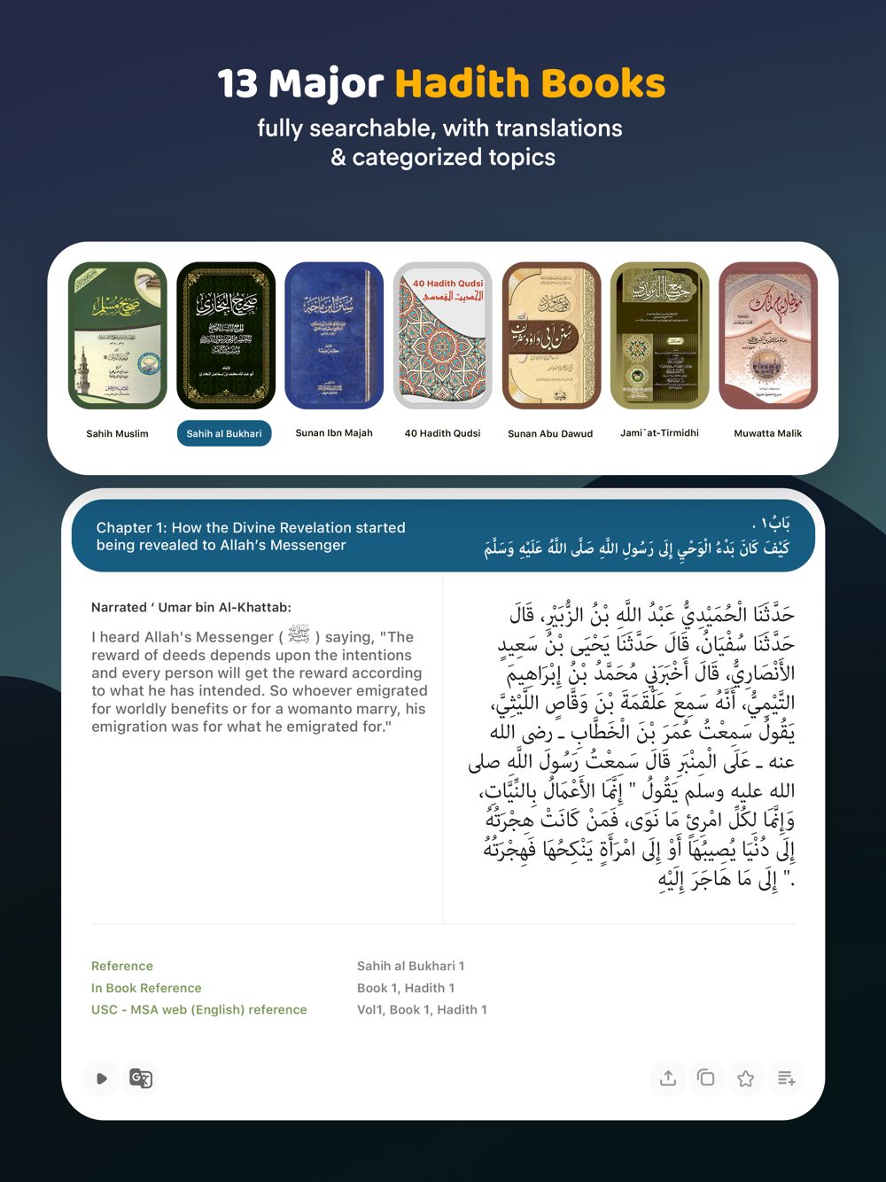 - 'Hadith Collection' section, containing complete Arabic Hadiths text & their translations for the following Hadith books: Sahih al-Bukhari, Sahih Muslim, Sunan an-Nasa'i, Sunan Abi Dawud, Jami` at-Tirmidhi, Sunan Ibn Majah, Muwatta Malik, 40 Hadith Nawawi, + more. Hadith section also supports searching.