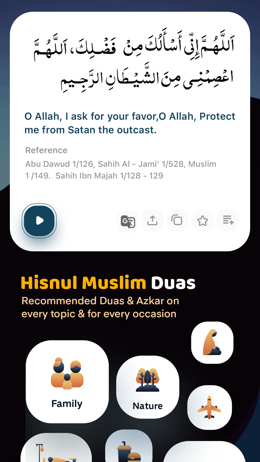 - Hisnul Muslim section, contains dua's for different aspects of life