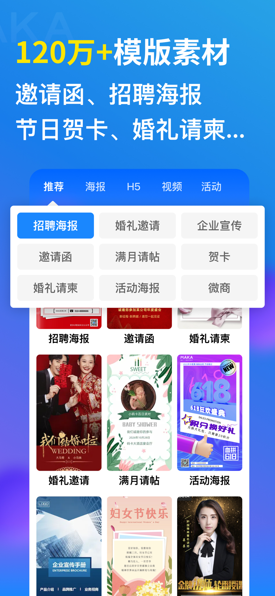 MAKA丨做出好设计,一款兼顾H5、海报、视频、GIF动图、微商和电商素材的创意设计和营销推广工具APP,拥有30W+设计师资源,海量创意模版无限畅用。10秒钟出稿,帮助企业和个人快速便捷完成营销推广。