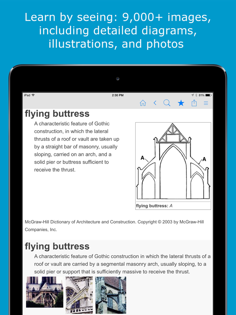 Whether you're an architect, architecture student, engineer, designer, or just interested in architecture, this free architecture dictionary app can help you find clear, in-depth definitions and images right on your iPhone or iPad. Search multiple architecture encyclopedias and dictionaries for entries on: