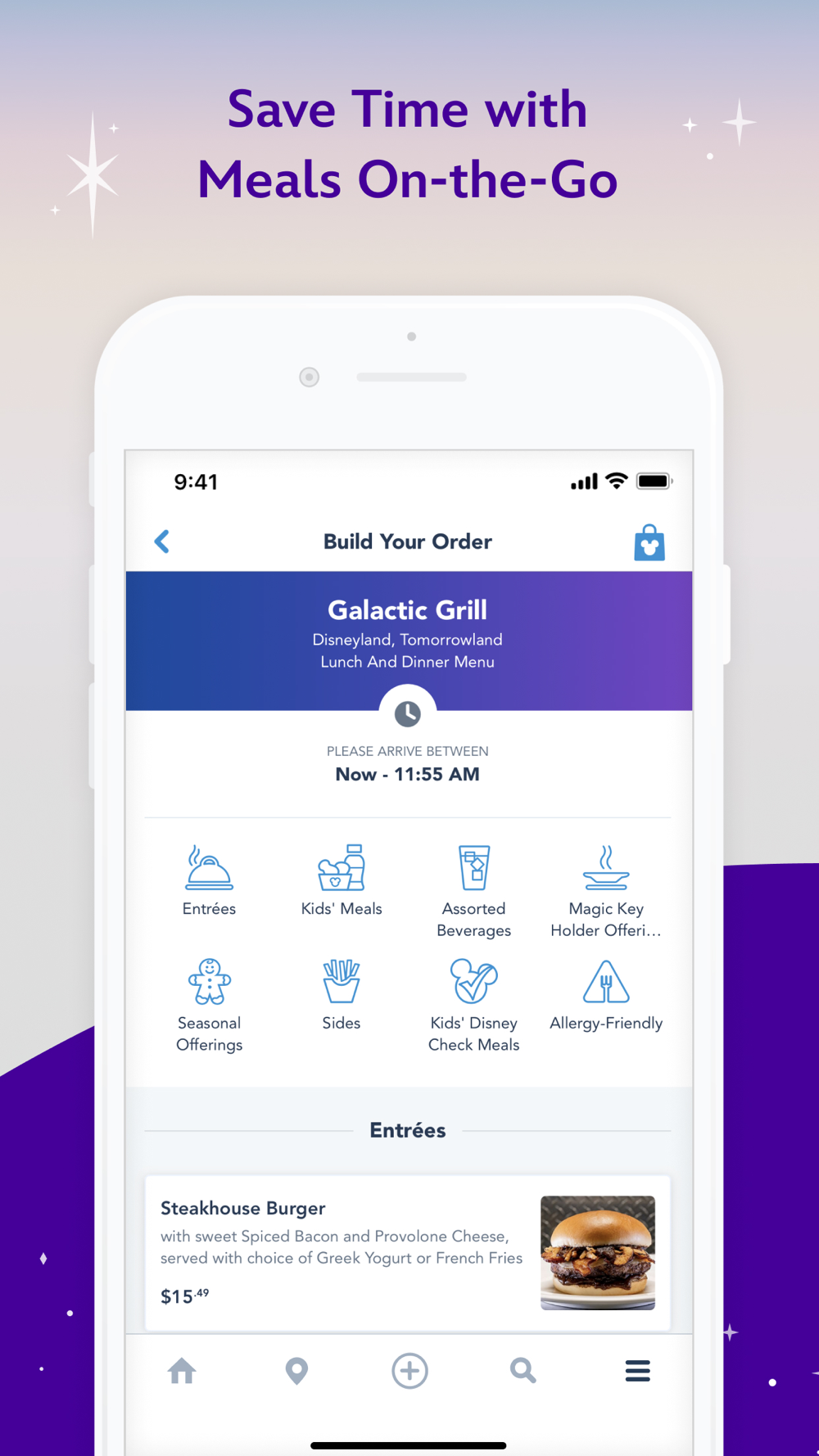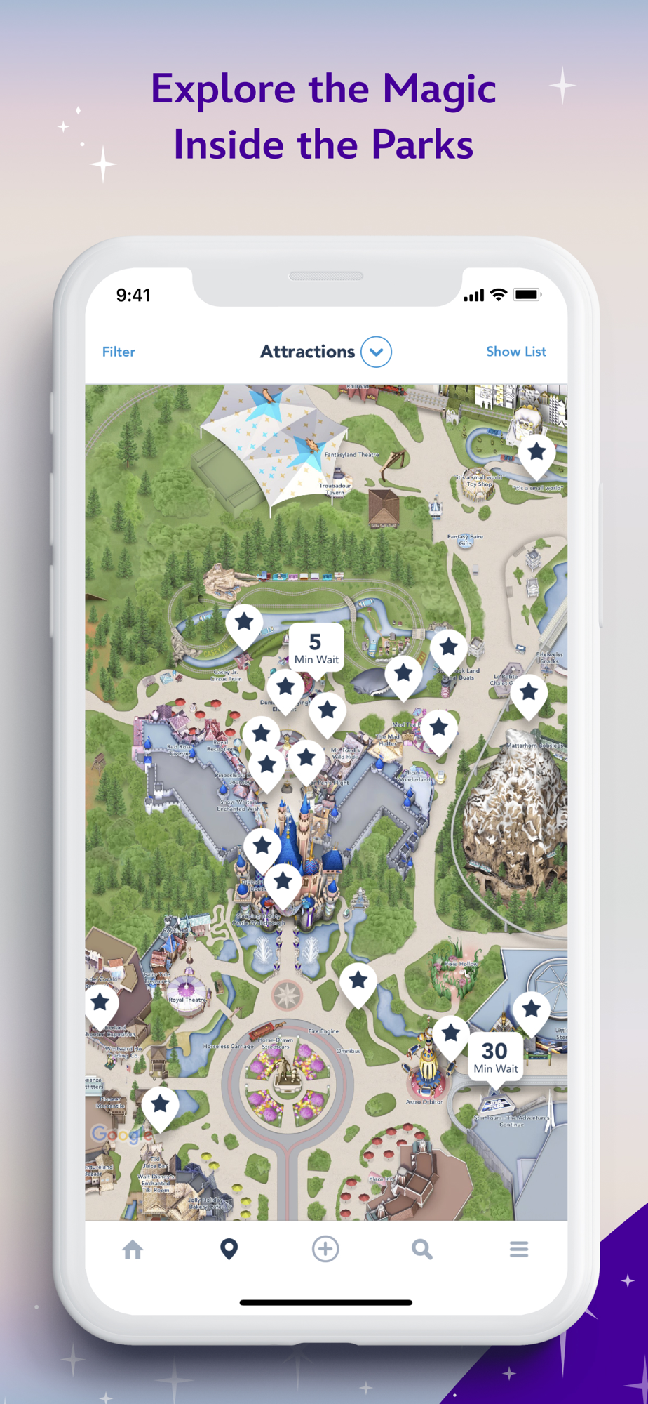 Quickly access current estimated wait times and forecasted wait times for attractions, check park hours, find Character Greetings, view showtimes and more.
