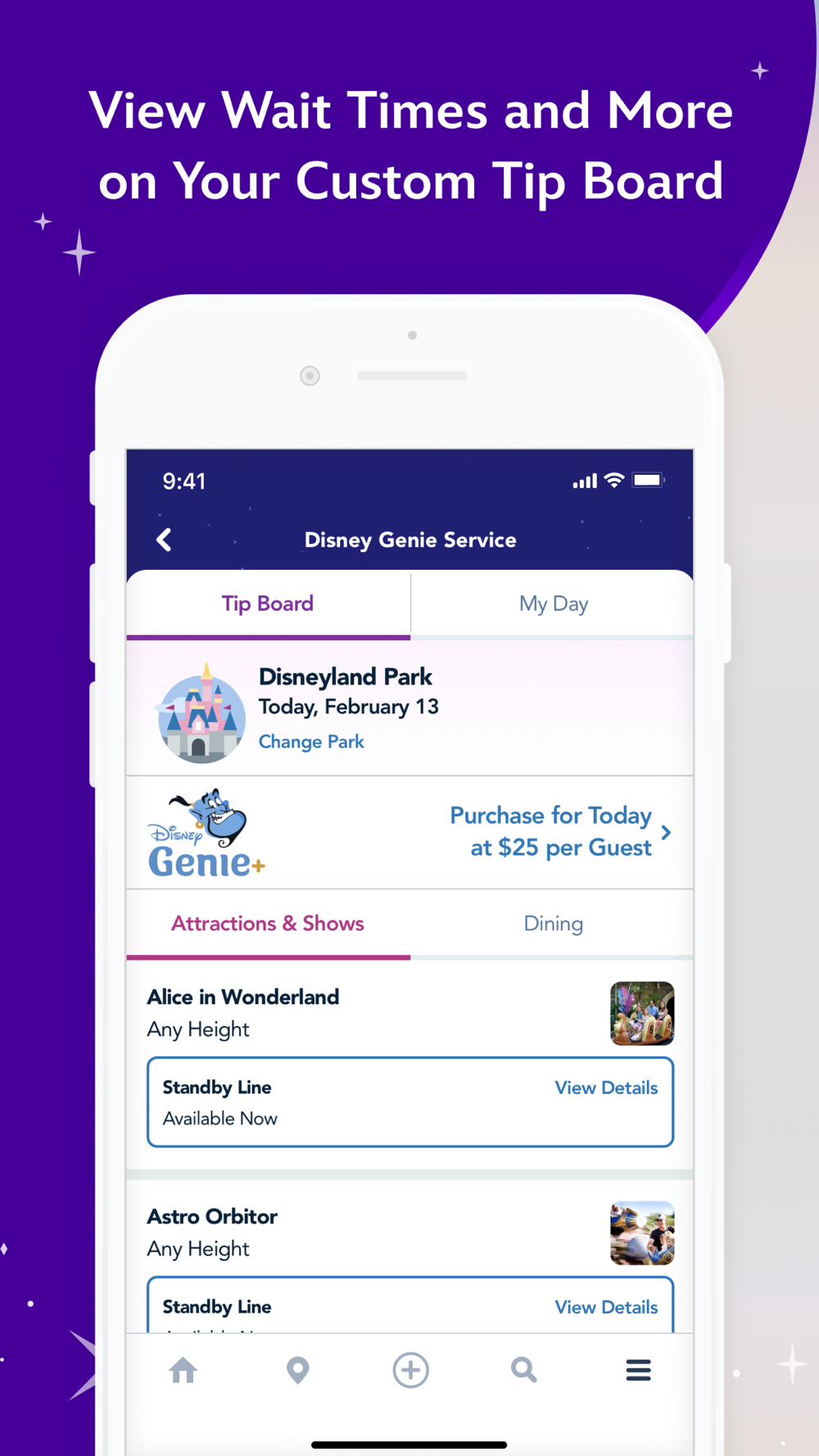 Create your very own personal Tip Board to track estimated wait times for your favorite experiences and more.