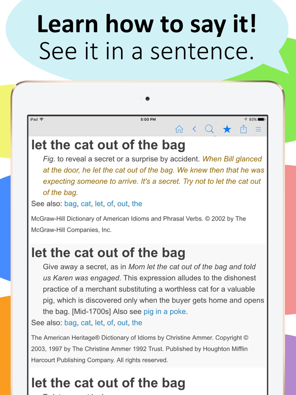 * View multiple example sentences to see how an idiom is used in everyday speech.