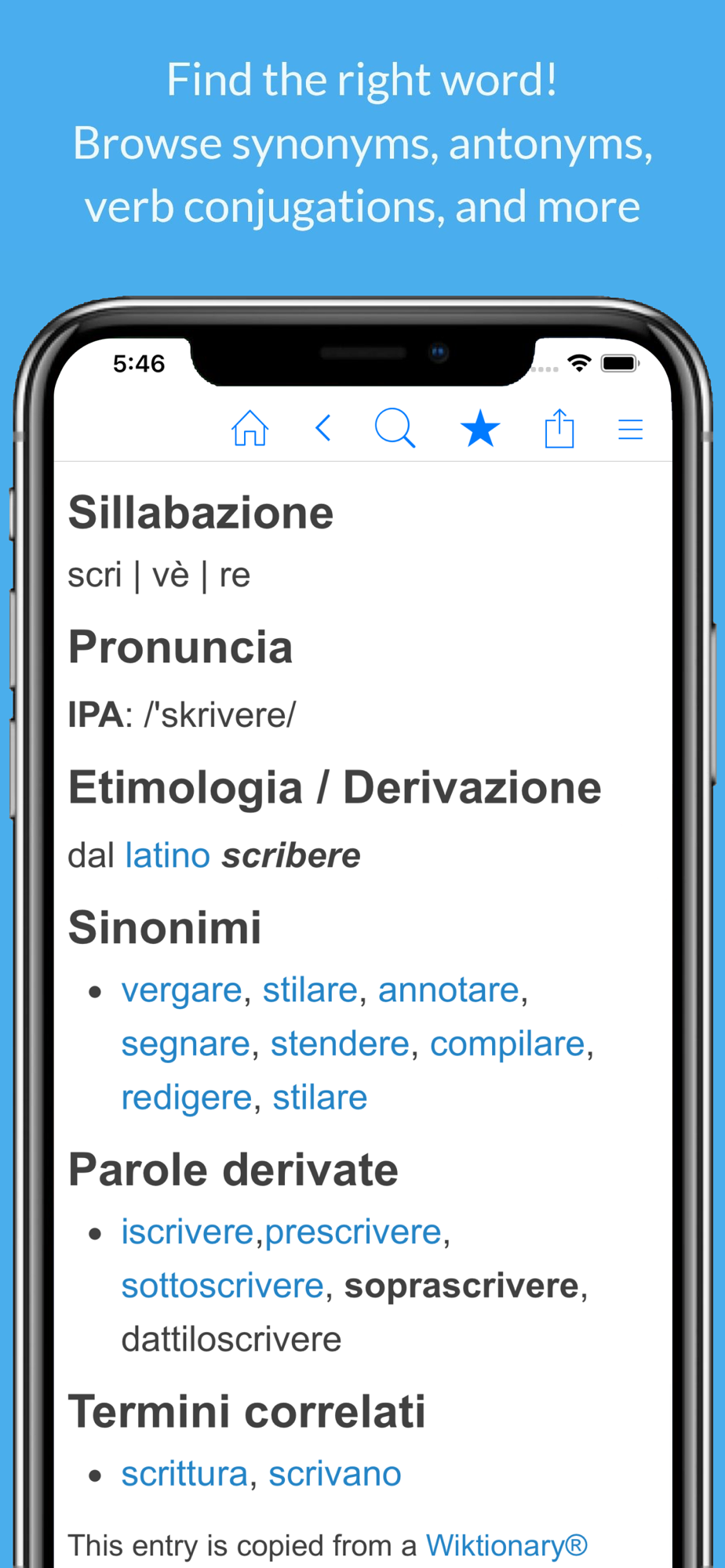 * 62,000+ Italian definitions, including verb conjugations, all from authoritative sources.