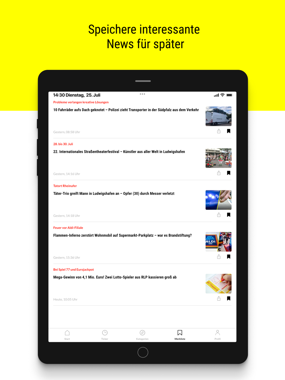 Mit der optionalen Push-Nachrichten-Funktion wirst Du über alle Neuigkeiten benachrichtigt. Außerdem kannst Du nun interessante Meldungen über die Bookmark-Funktion speichern und später in Deiner Merkliste abrufen sowie alle Artikel mit Deinen Freunden teilen.