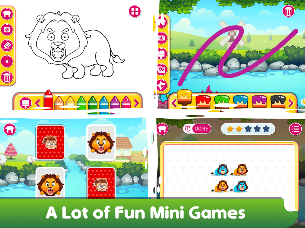 > 6 fun and educational mini games including Memory Games, Coloring Books, Sticker Books, Row your boat, Paint The Lion, and Spot The Difference.