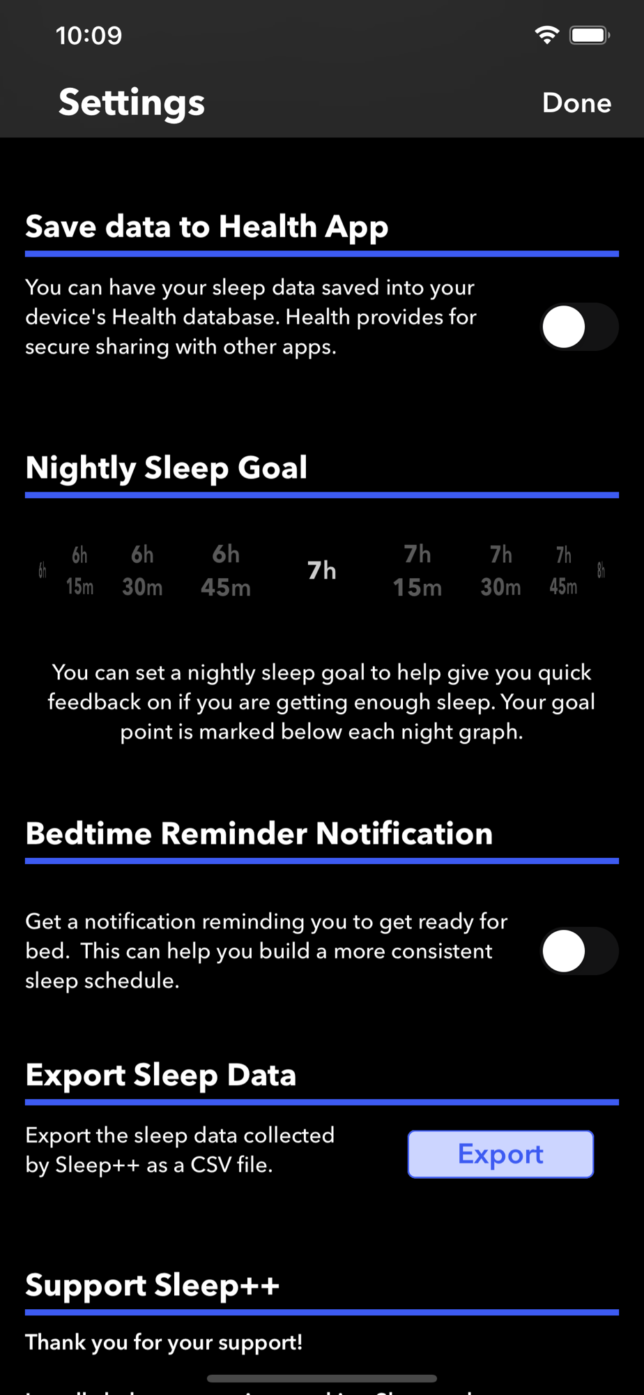 Sleep++ integrates with the Health App providing you a safe and private way to share your activity data with Sleep++. This data is used for automatic sleep tracking. You can also optionally have Sleep++ save your Sleep Analysis into your Health database after each night.