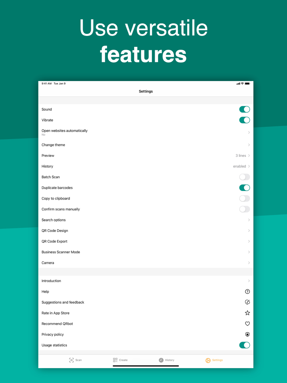 • Export your scan history (as CSV file). Import it to your favorite spreadsheet (Excel, Numbers, etc.) or save it to any cloud storage (iCloud Drive, Dropbox, Google Drive, etc.).