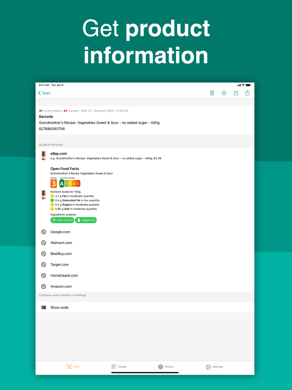 • Get specific information by adding custom websites into the barcode search (i.e. your favorite shopping website).