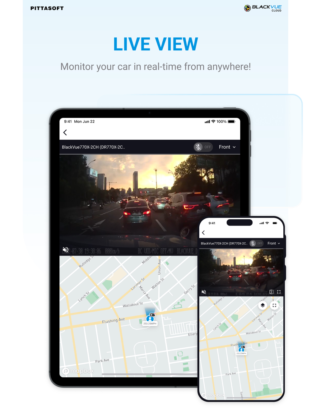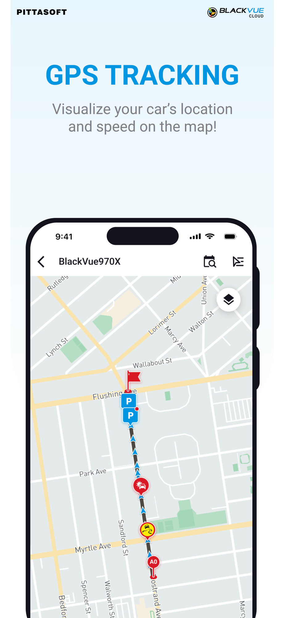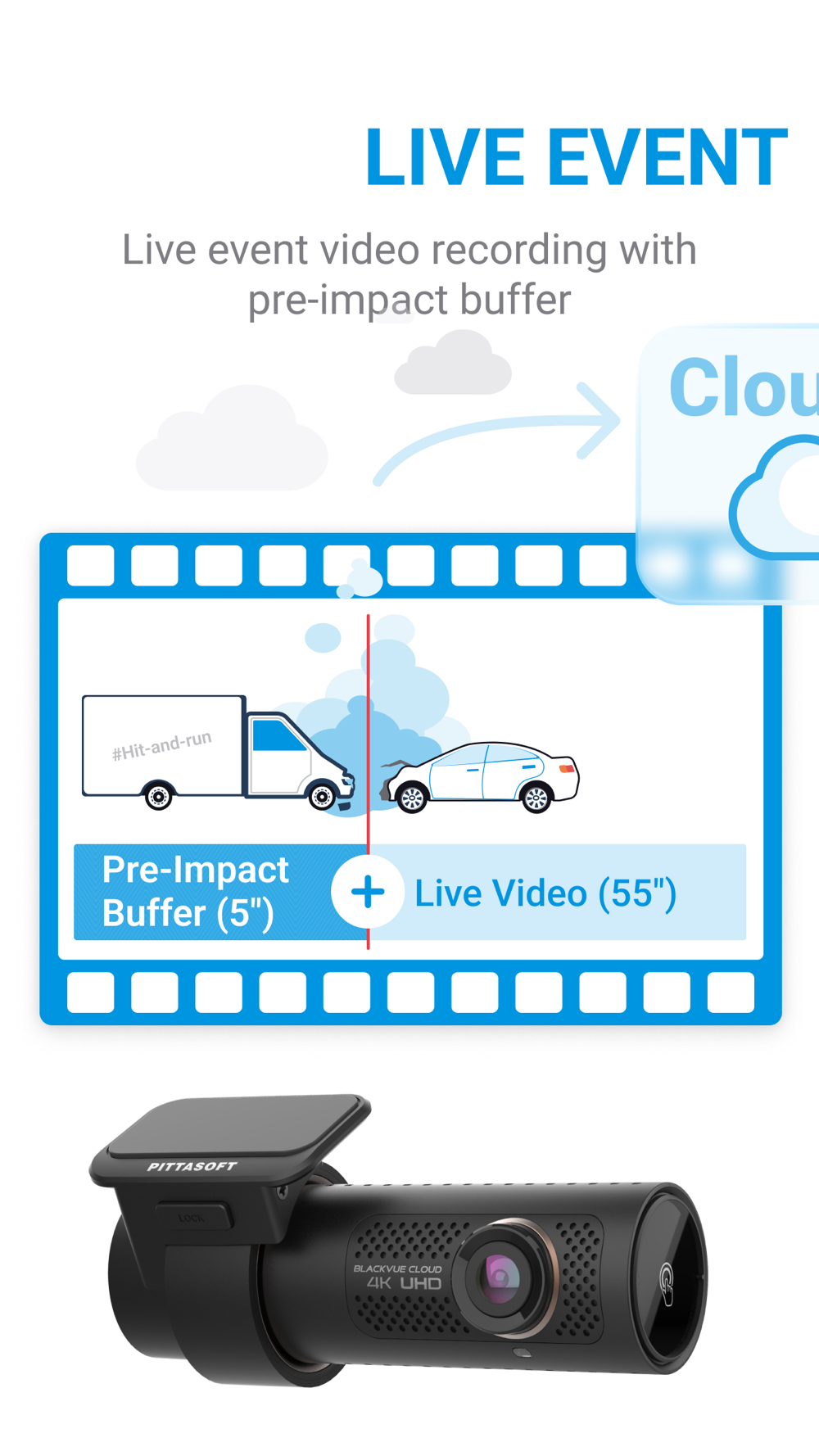 Taking advantage of a mobile or car-embedded Internet connection and a BlackVue dashcam, BlackVue Cloud connects you to your car through the Cloud. Using the BlackVue App on your smartphone or tablet, you see in real time where your car is located and what is happening around it.
