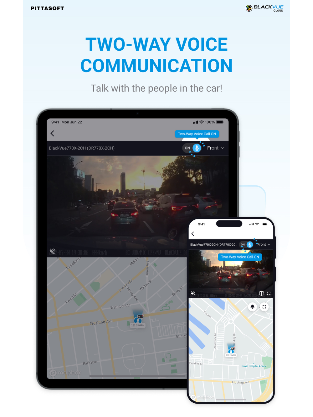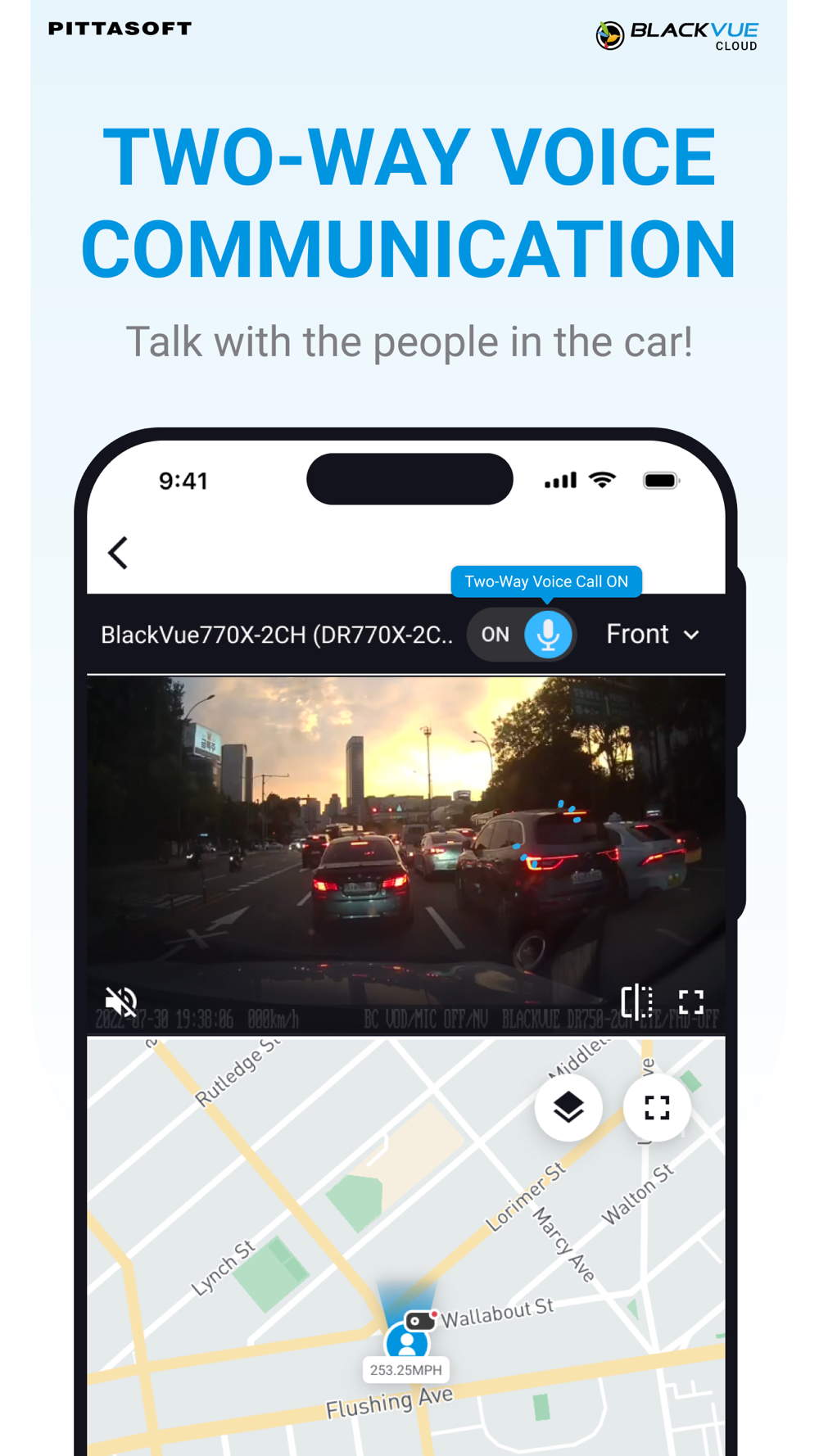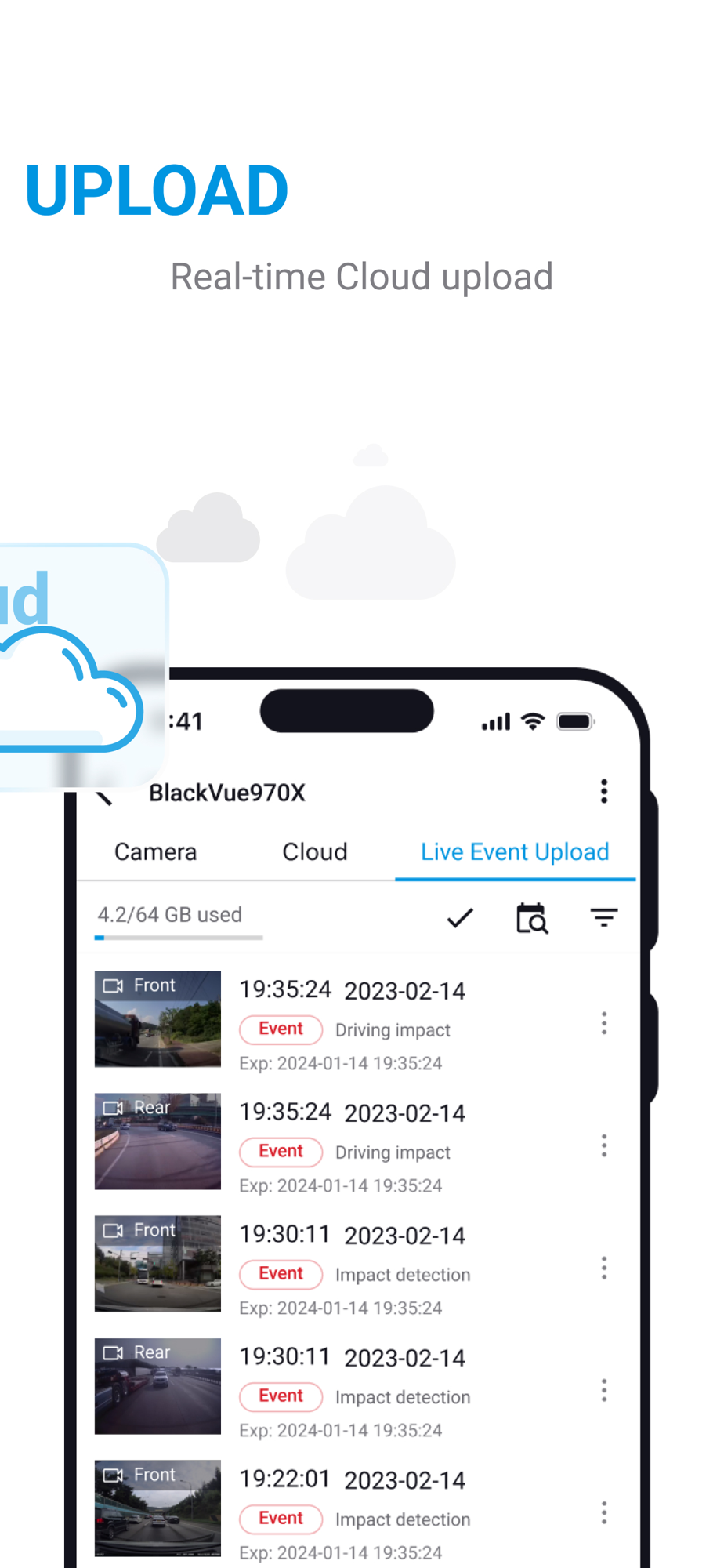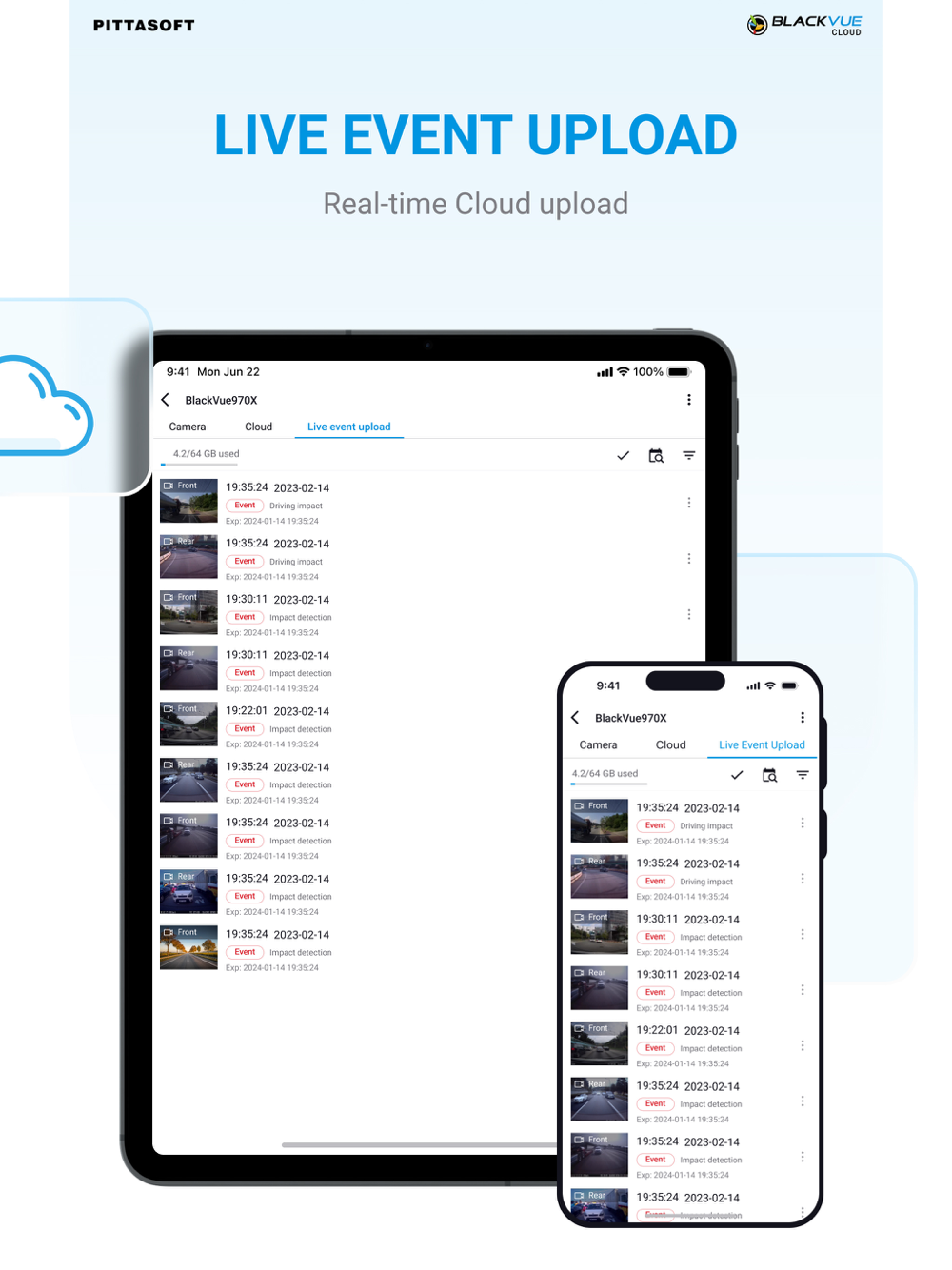 Taking advantage of a mobile or car-embedded Internet connection and a BlackVue dashcam, BlackVue Cloud connects you to your car through the Cloud. Using the BlackVue App on your smartphone or tablet, you see in real time where your car is located and what is happening around it.
