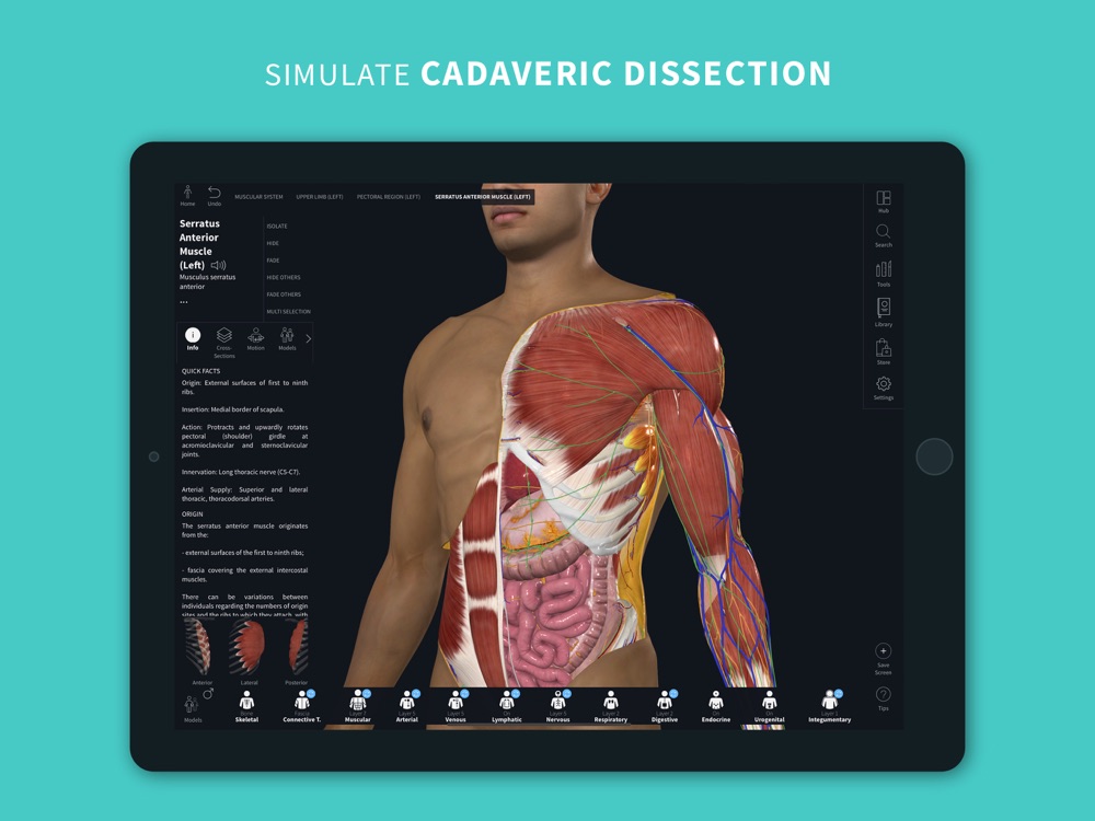 Dynamic Cross-sections, real-time Muscle Motion, Insertion & Origin mapping, Bone Surface & Landmark mapping, 12 layered systems, Nerve Tracer, Blood Supply Tracer