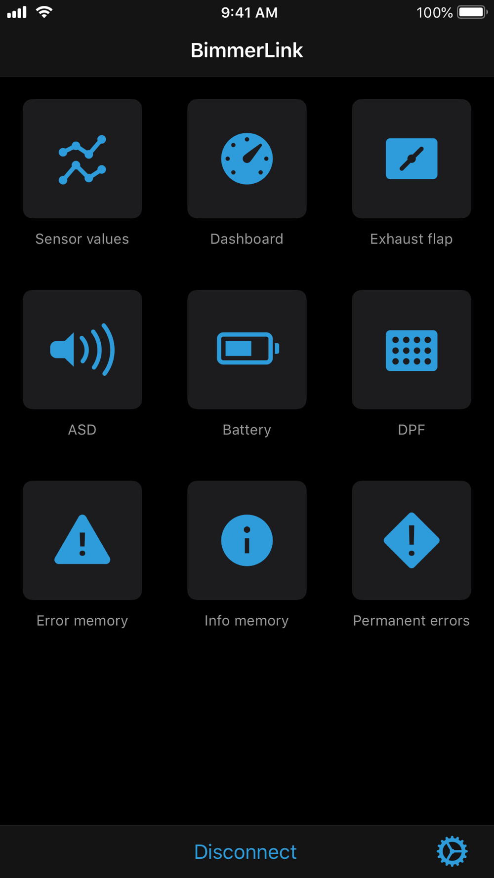 BimmerLink for iOS is the direct link to your BMW or Mini. Using an OBD adapter you can read trouble codes or display sensor values in realtime, check the current state of the DPF in your car or register a new battery after replacement. BimmerLink even allows you to remotely control the exhaust flap or mute the Active Sound Design in your car.