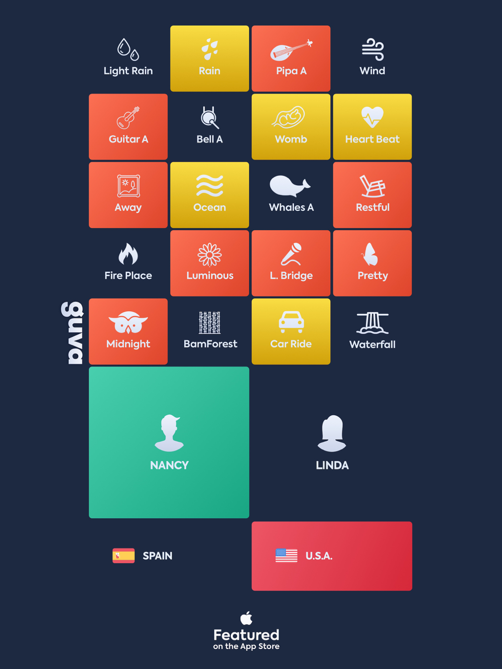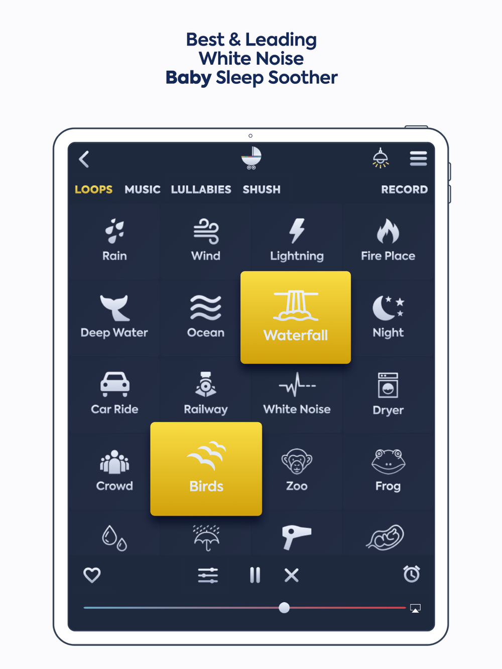 Loops: Rain, White Noise, Zen, Ocean, Waterfall, Birds, Underwater, Chill-Out, Railway, Hair Dryer, Heartbeat, Night, Dryer, Vacuum, Lightning, Wind, Crowd, Classic Music, Car Ride, Fireplace, Flute, and many more...