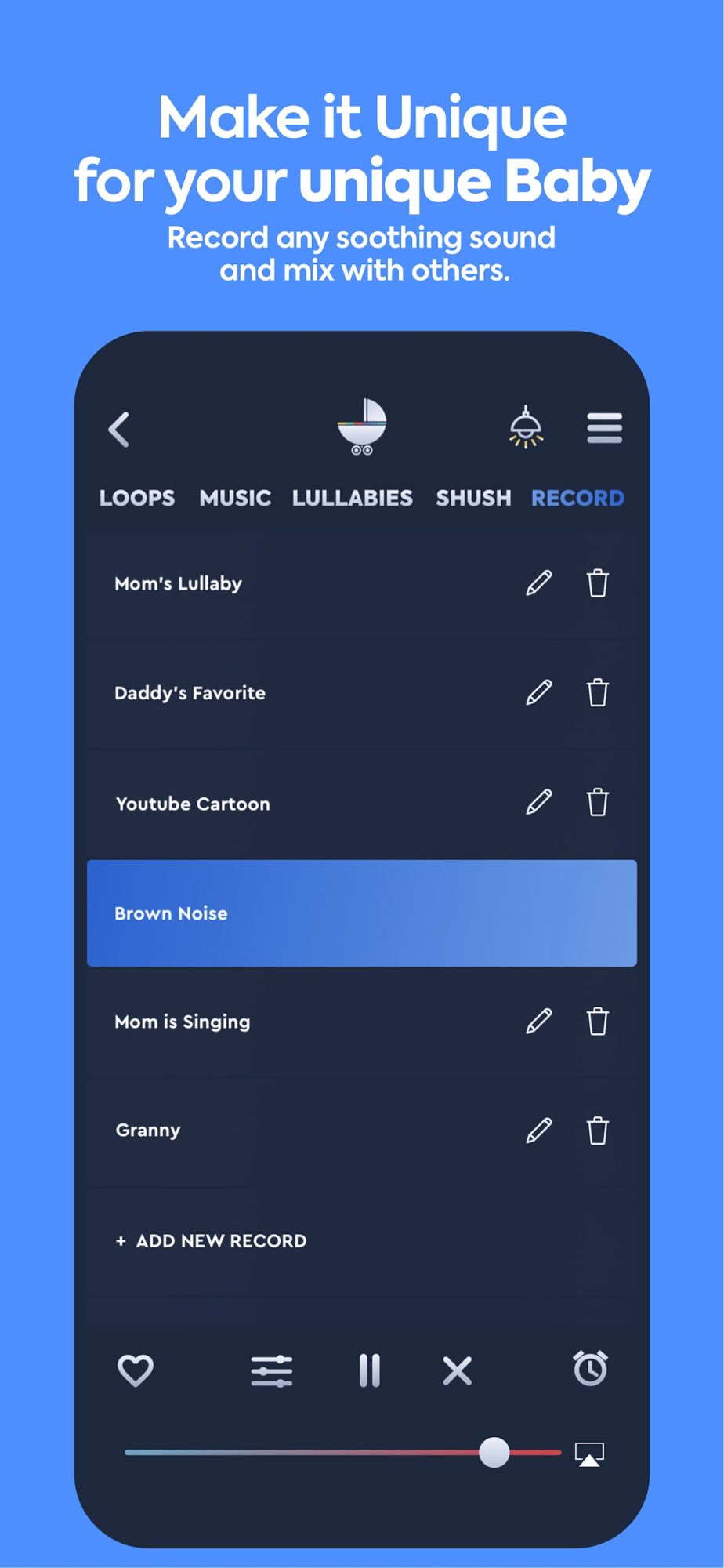 • Select sounds and combine them to create a mix that your baby loves.