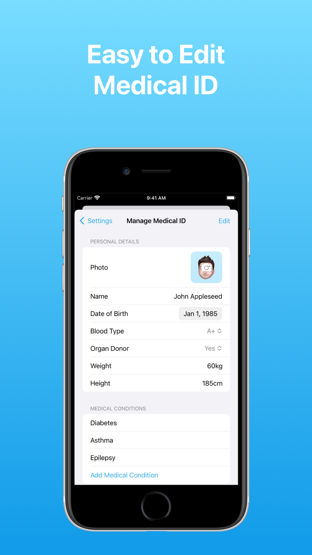 All medical ID data is stored securely on your own private iCloud account using the secure Keychain functionality. No data ever leaves your device.