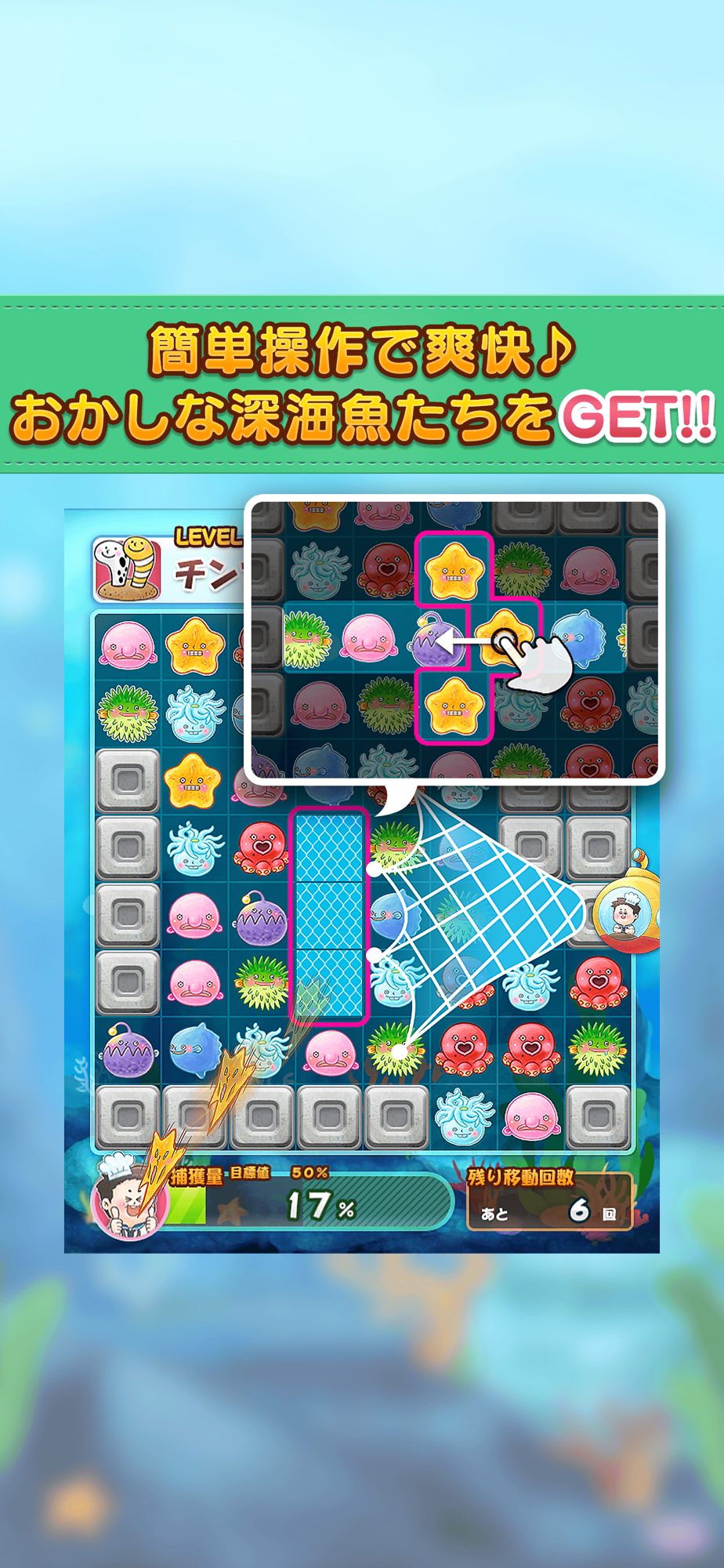 同じ種類の深海魚を3つ並べてGETする(消す)だけ!