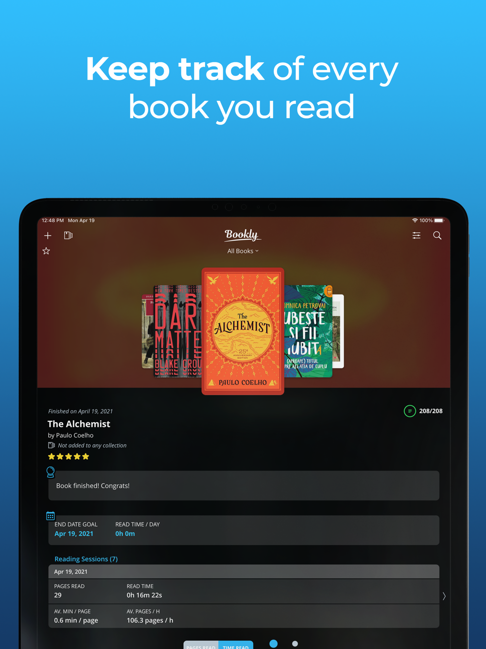 Bookly helps you track your reading in real-time, manage your books, make a habit out of reading and see your progress over time.