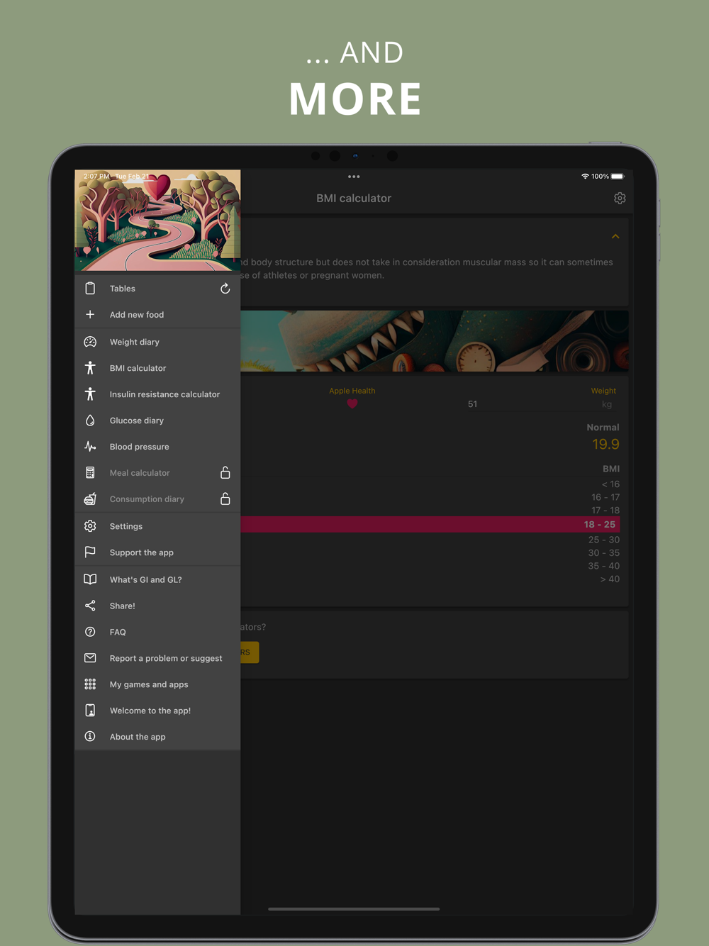 The app supports Apple Health which helps to sync measurements with electronic scales, glucometers and blood pressure monitor. Using the app with the Apple Health app on your device empowers you to better manage your health.