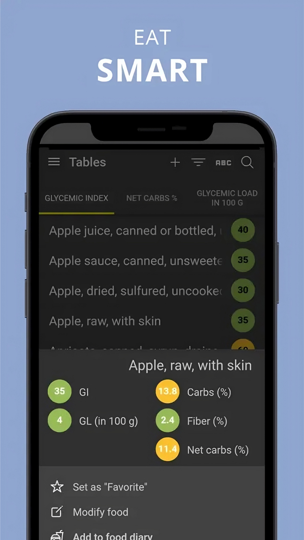 * Food diary to keep track of your food, glycemic load and carbs consumption