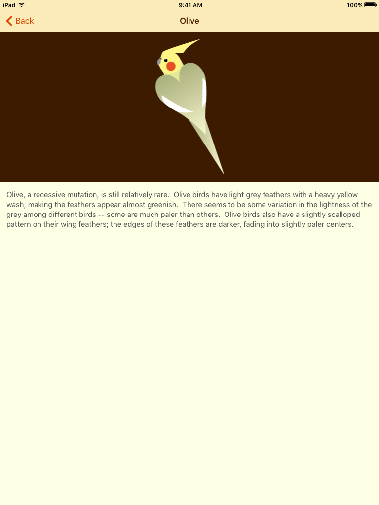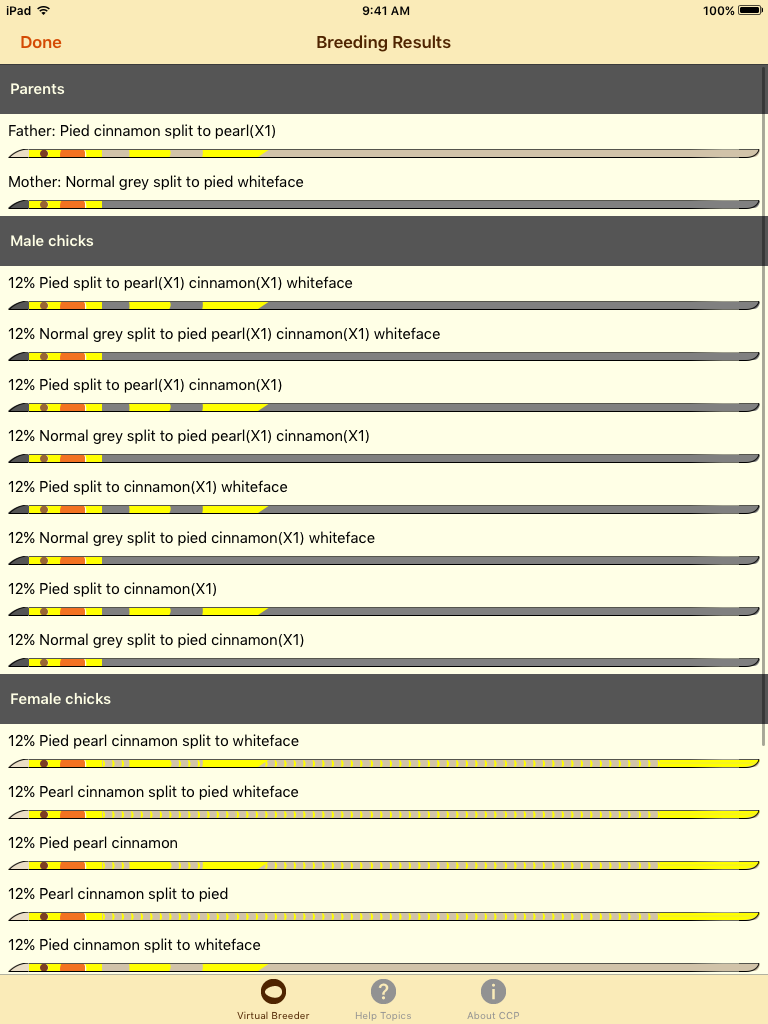 The Cockatiel Color Palette is a valuable tool for hobby breeders, professionals, and anyone else who is interested in cockatiel color mutations and inheritance. The centerpiece of the app is the Virtual Breeder, a genetic calculator which eliminates the need for complicated hand-drawn diagrams. Just enter the parents' mutations, and the Virtual Breeder lists all possible chick types, including splits, crossovers, and the probability of each type's occurrence in the nest box.