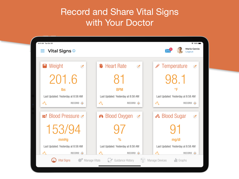 Vital Tracking – Track your vital signs including weight, heart rate, temperature, blood pressure, oxygen level and blood sugar. Integration with Healthkit.
