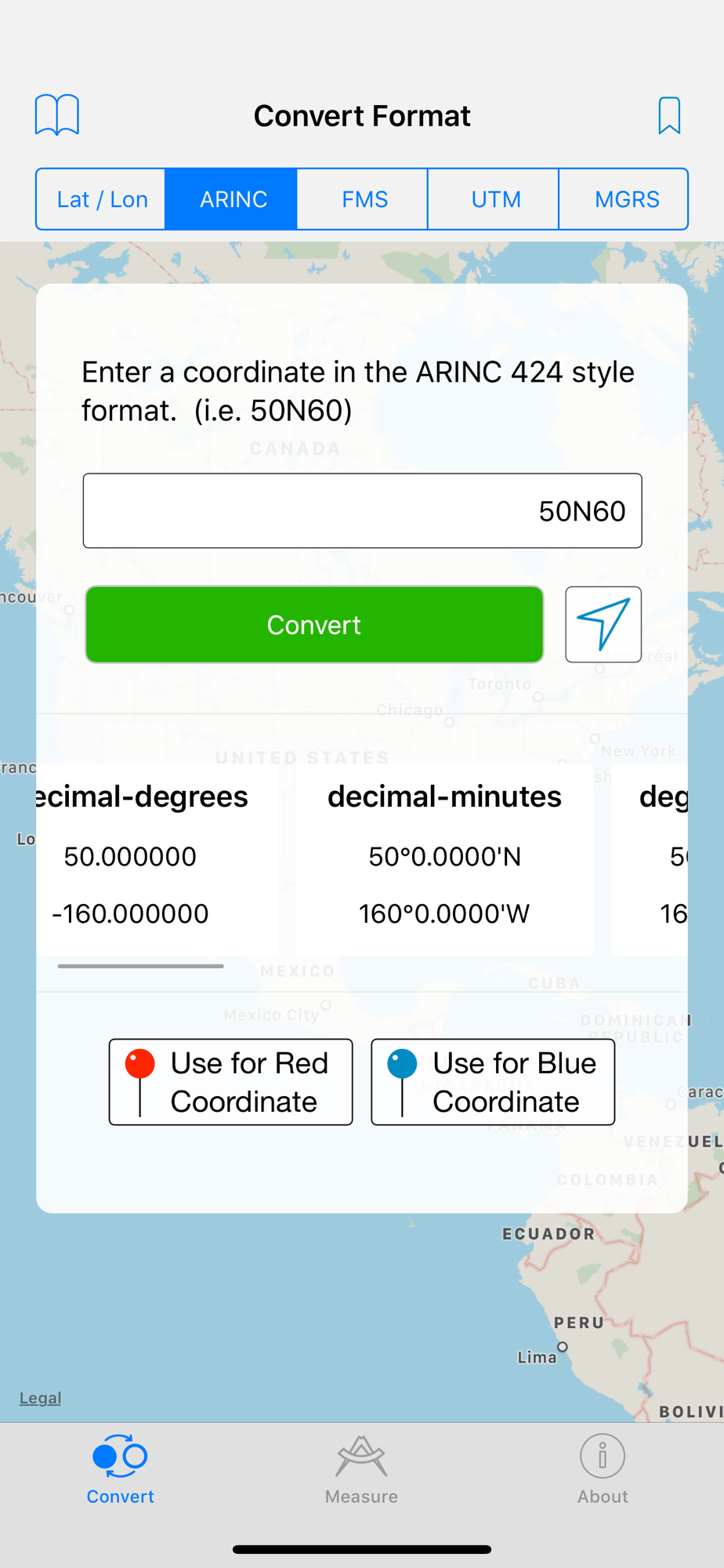 Easily and quickly convert between coordinate formats including decimal degrees, degrees-minutes-seconds, degrees and decimal minutes, UTM, MGRS, ARINC 424, and FMS style coordinates.