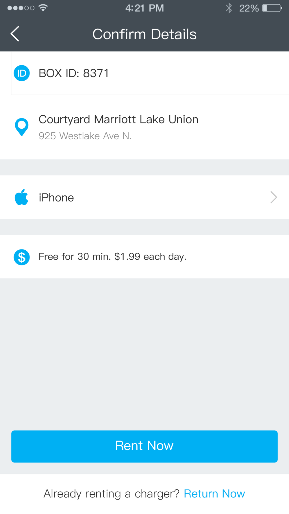 Located in businesses across Seattle, AnkerBox dispenses portable phone chargers. Chargers can be rented from and returned to any box using the AnkerBox app. Charge your phone anywhere. No cords. No outlets. No awkwardly waiting by a wall. It’s free for 30 minutes. Then, $1.99 each day.
