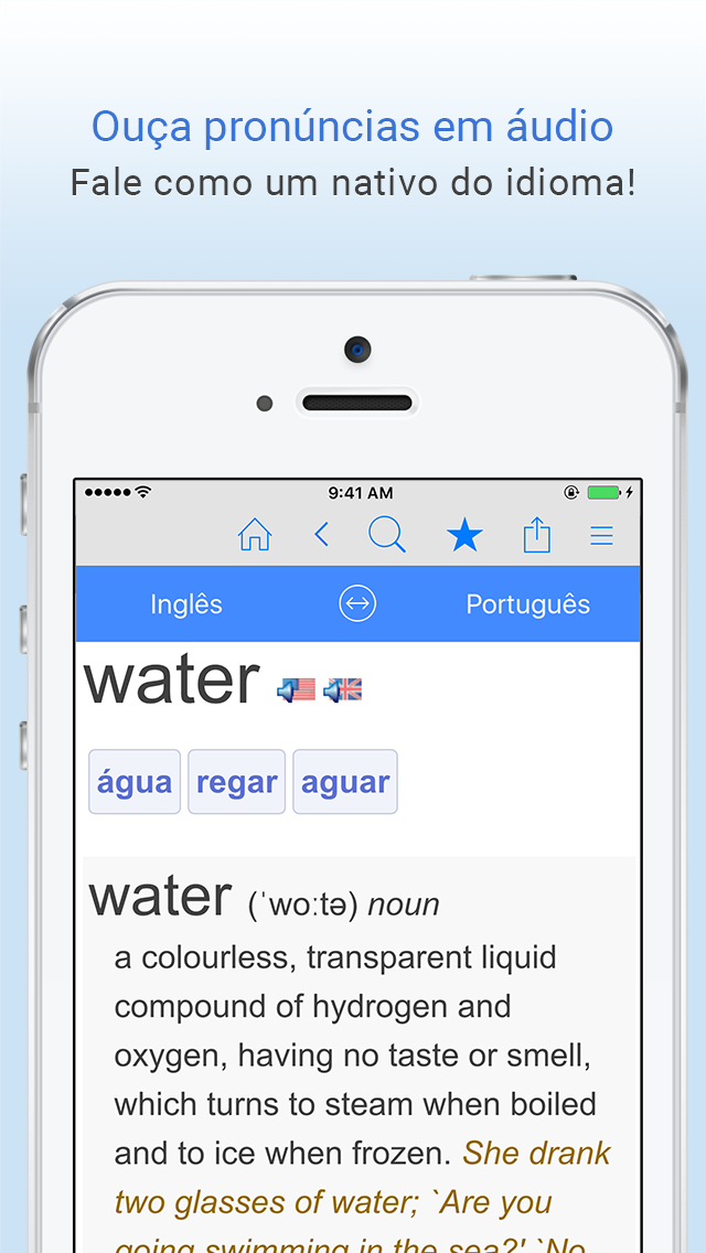 Traduza palavras e frases comuns do português para o inglês OU do inglês para o português! O Dicionário de Traduções Português-Inglês da Farlex mostra traduções instantâneas com busca de voz ou texto, além de pronúncias em áudio, definições, sentenças de exemplos e muito mais!