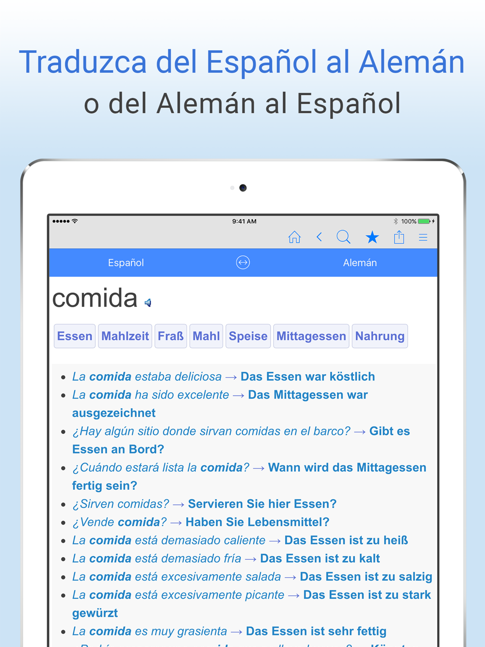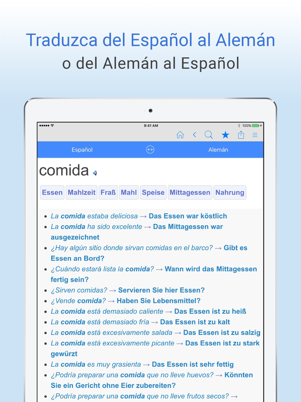 Traduzca palabras y frases comunes del Español al Alemán o del Alemán al Español. ¡El Diccionario de Traducción Español-Alemán de Farlex le entrega traducciones instantáneas con búsqueda por voz y texto, más pronunciaciones con audio, definiciones, ejemplos de oraciones, y más!