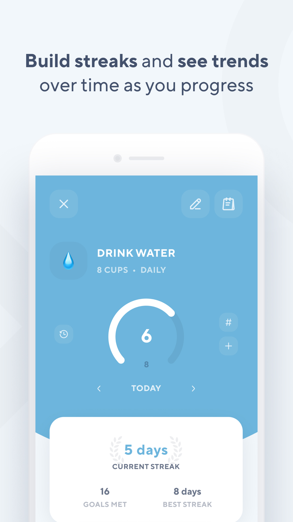 After setting tangible daily or weekly goals, Done will help you track your habits and tell you when you've met your goal. Done also keeps track of Streaks when you've met your goals in consecutive periods.