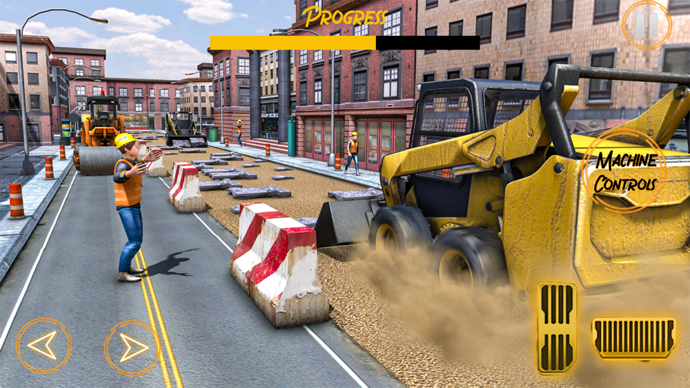 Build roads and bridges for the new city. Your goal is to construct a modern city. Operate heavy machinery like hydraulic lifter, excavator, bulldozer, transport truck & road painter to perform each step in road and bridge construction. Drive, park, transport material and control heavy machinery in this construction simulator game.