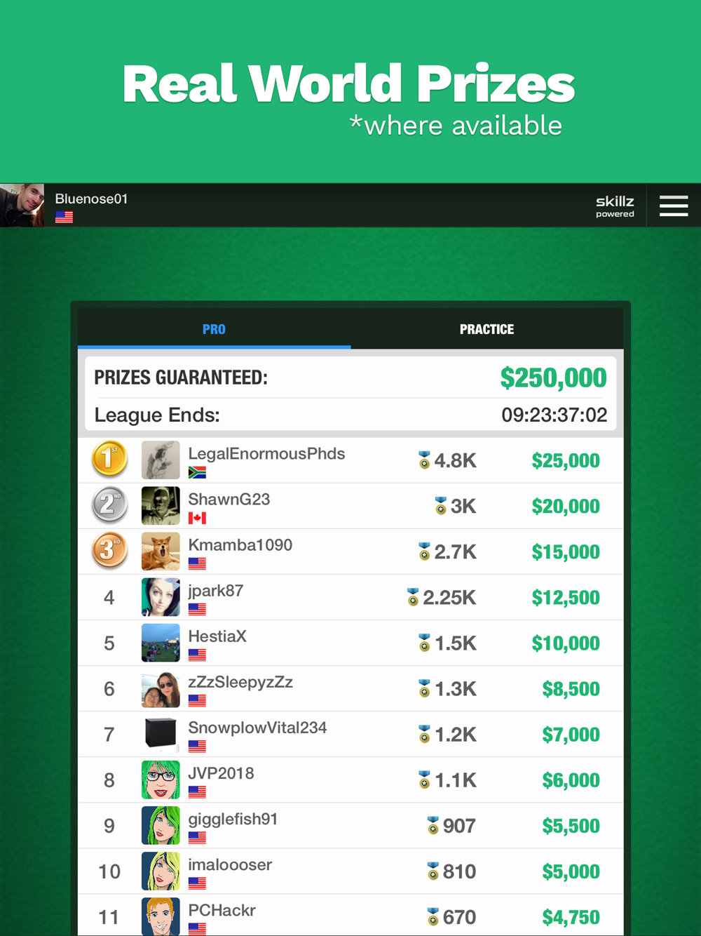 • Challenge people around the world with Skillz, a competition platform complete with leaderboards, trophies, real cash prizes or virtual currency prizes, and an amazing loyalty program that rewards you for playing!