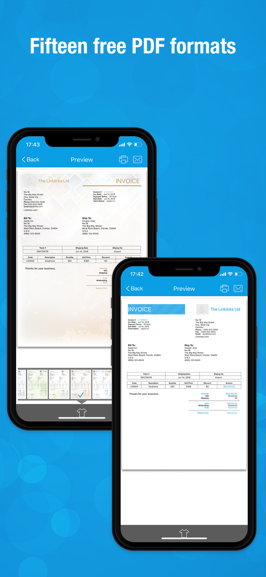 You can create unlimited invoices, estimates, purchase orders, credit memos and sales receipts.