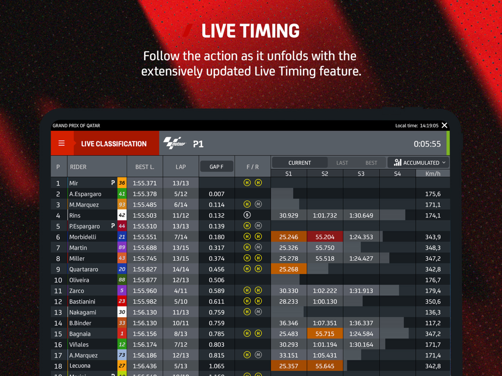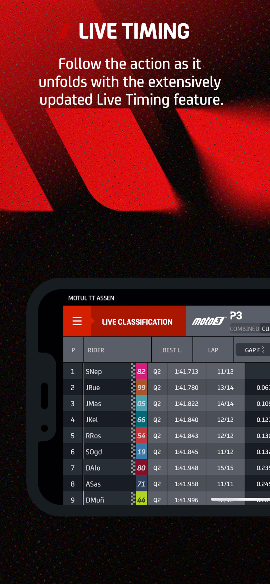 Follow the action as it unfolds with the extensively updated Live Timing feature, and watch lap times progress as the riders speed through each sector of the track. Split times, sector tracking and exclusive data allows you to see exactly how the riders are performing throughout each lap and chart the riders as their teams and mechanics do. Available to you LIVE!