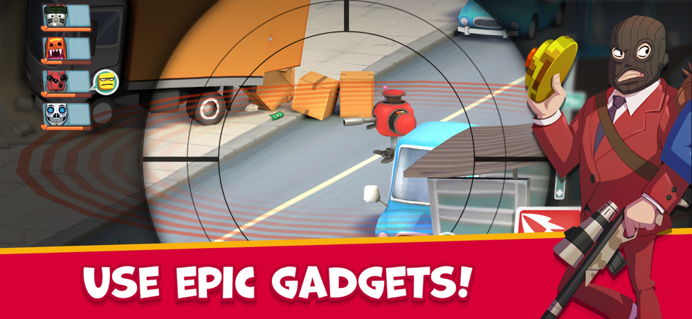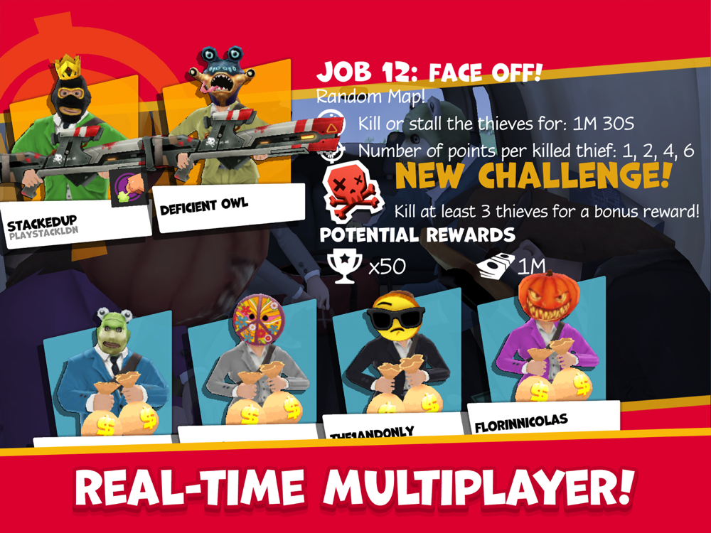 Multiplayer Asymmetric gameplay. Two Unique ways to play, as the SNIPER, take out the THIEVES and protect you CASH from being taken. As the THIEVES