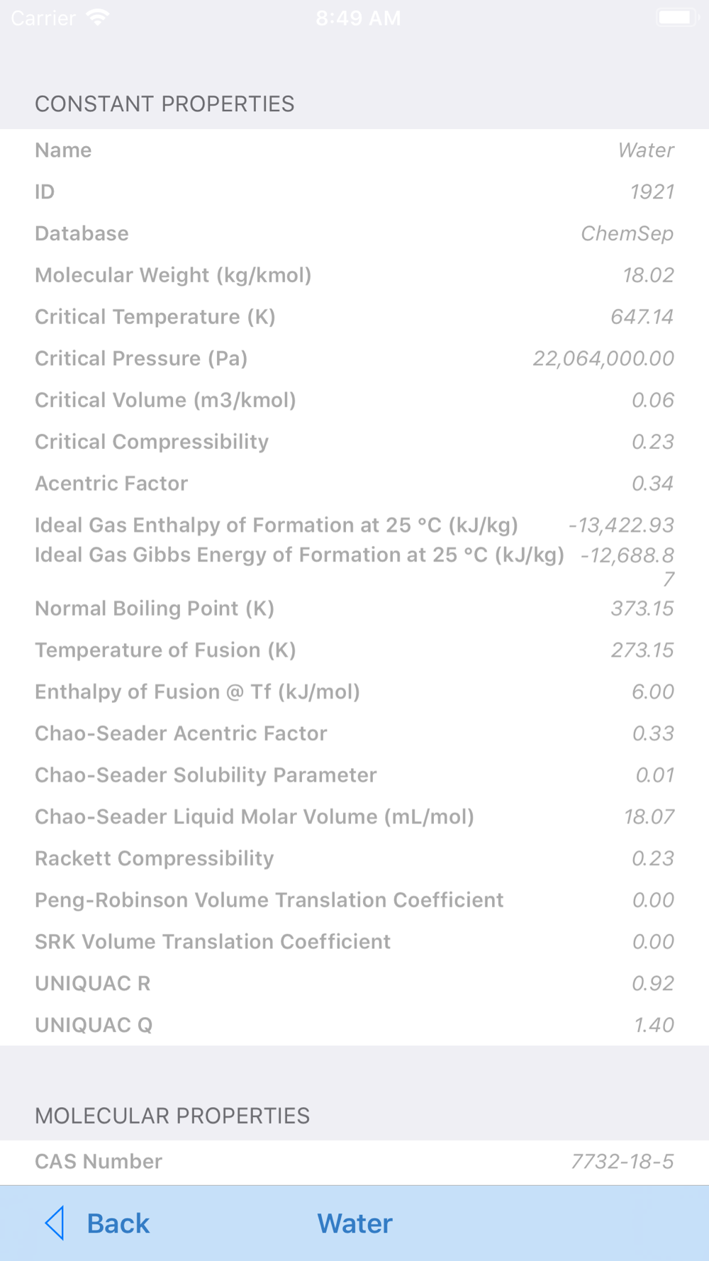 - Single-compound properties: Critical Parameters, Acentric Factor, Chemical formula, Structure formula, CAS Registry Number, Boiling Point Temperature, Vapor Pressure, Heat of Vaporization, Ideal gas Enthalpy, Ideal gas Enthalpy of Formation at 25 C, Ideal Gas Gibbs Free Energy of Formation at 25 C, Ideal Gas Entropy, Heat Capacity Cp, Ideal Gas Heat Capacity, Liquid Heat Capacity, Solid Heat Capacity, Heat Capacity Cv, Liquid Viscosity, Vapor Viscosity, Liquid Thermal Conductivity, Vapor Thermal Conductivity, Solid Density, Liquid Density and Molecular Weight