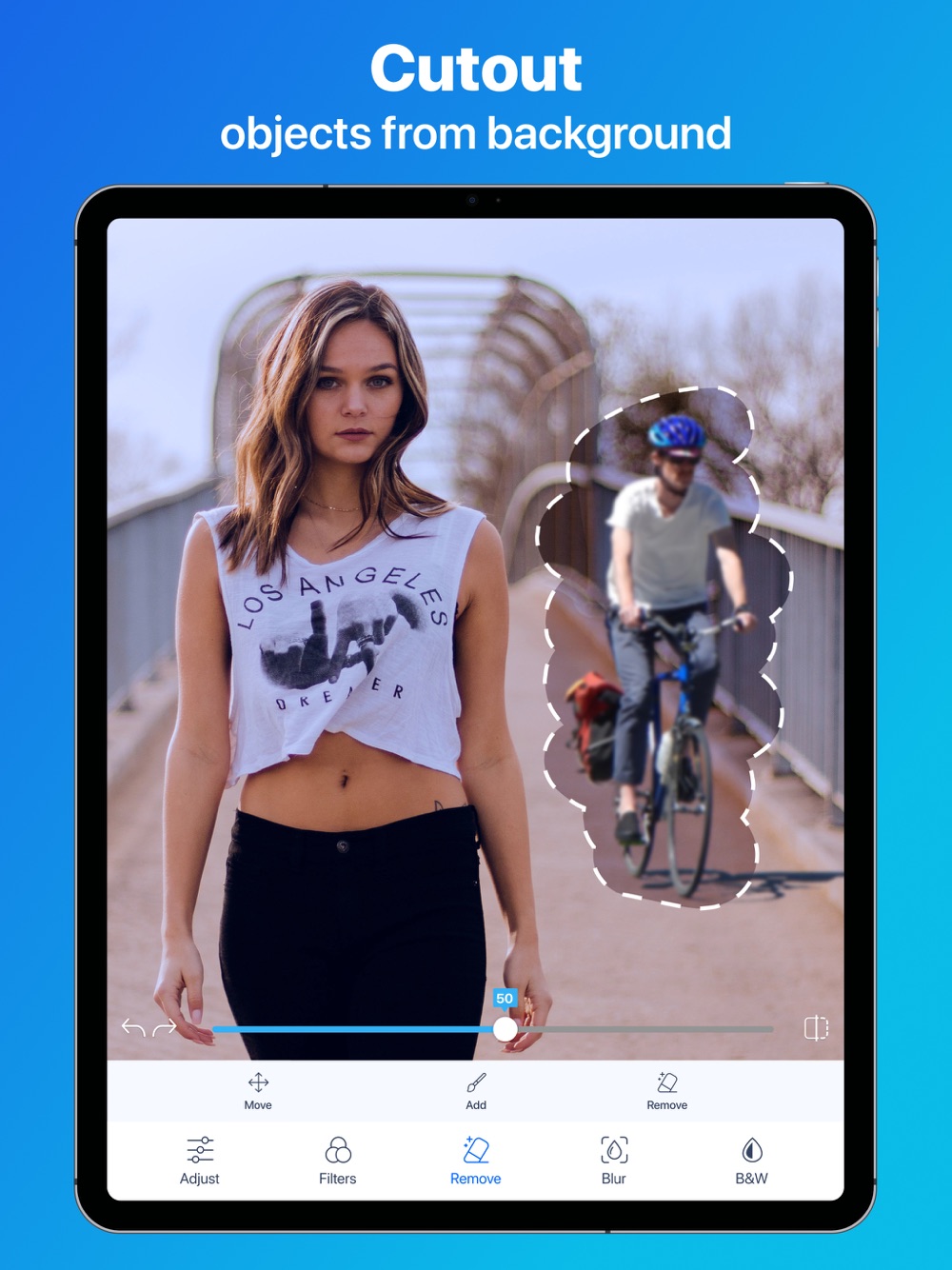 Our advanced technology will help you retouch your photos for whiter teeth and smoother skin. Remove objects from the background, share your photos and impress your followers. Selfie editing will never be the same.