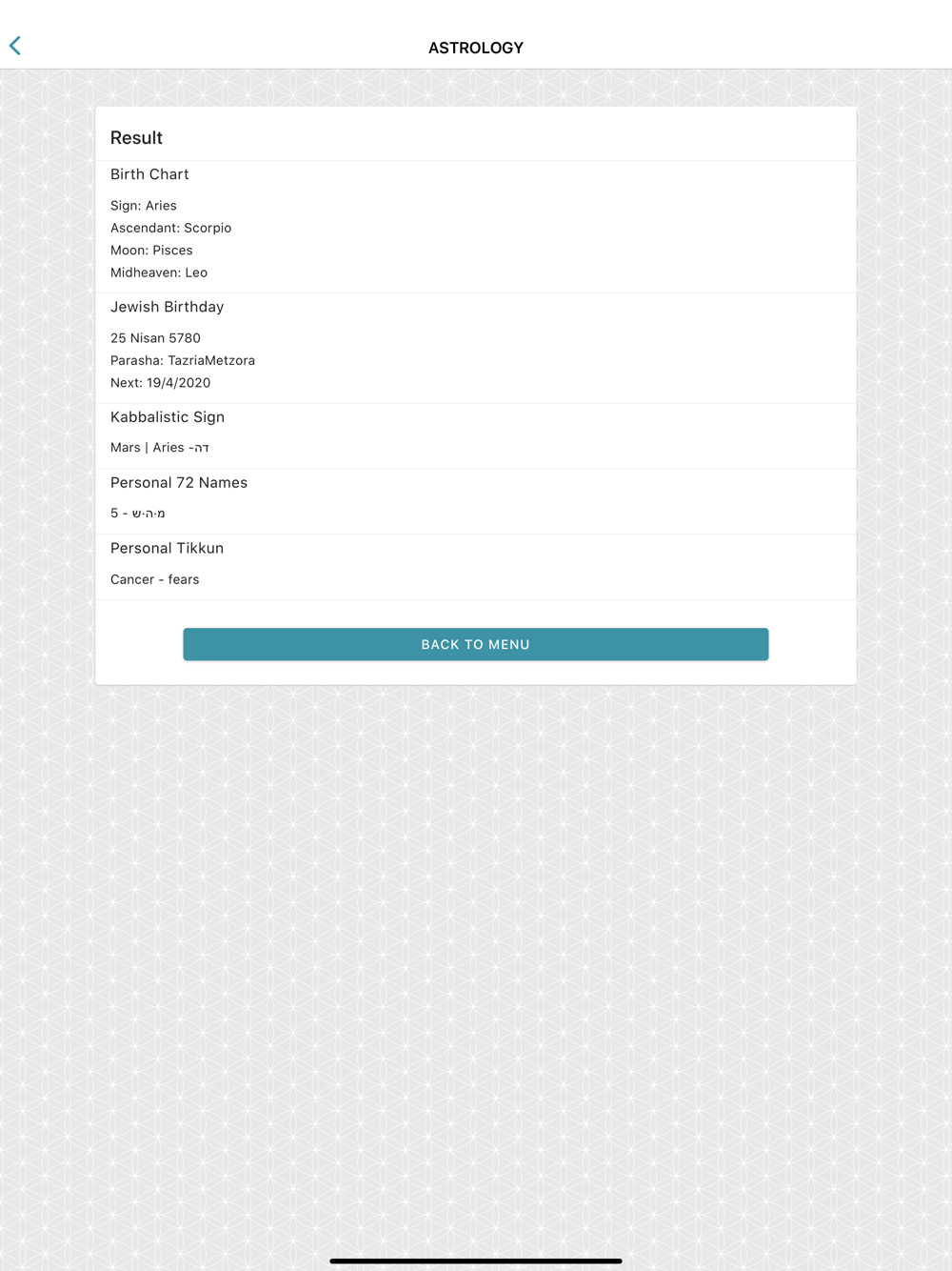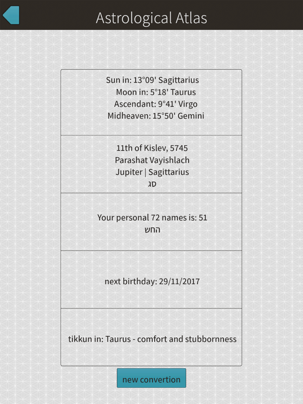- Astrological Chart (you kabbalistic sign, tikkun and personal 72 names)