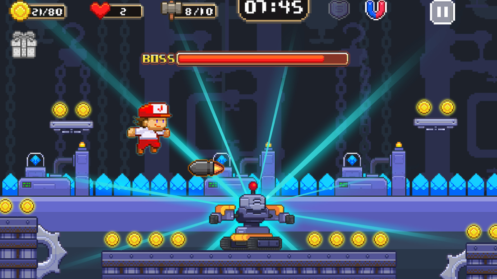Control buttons to run, jump and explore the arcades. Travel across dangerous jungle, desert, machinery base, etc. Collect coins, gold, acceleration props to help you defeat the Monster!