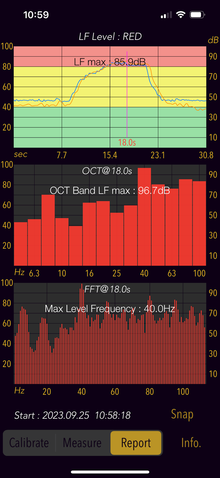 This app also allows you to examine the frequency component of the low frequency sounds by 1/3 octave band analysis and FFT analysis.