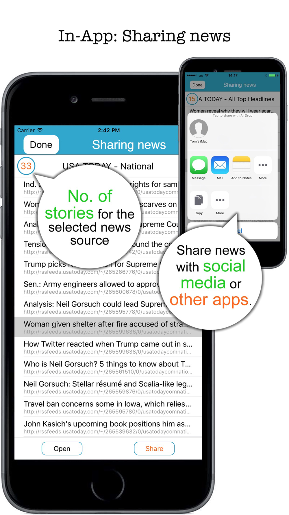 10.Add-on: Share news stories through social media (Facebook, Twitter, Weibo, TencentWeibo) or other apps (Message, Mail, Notes).