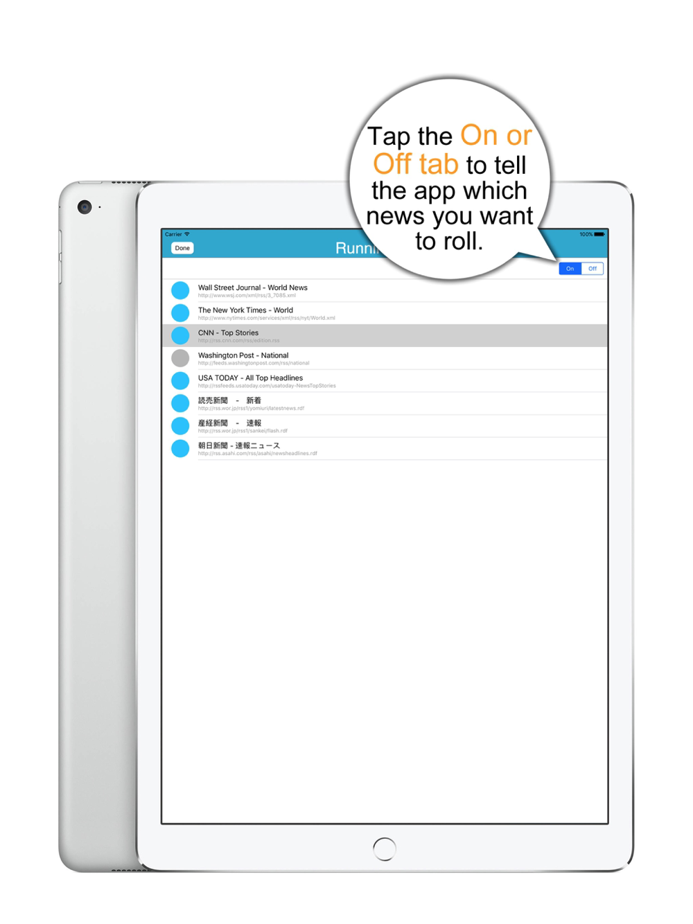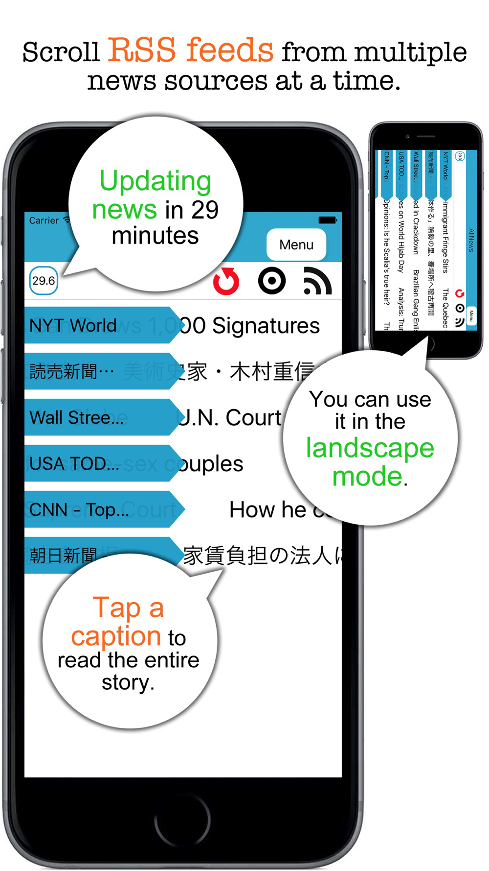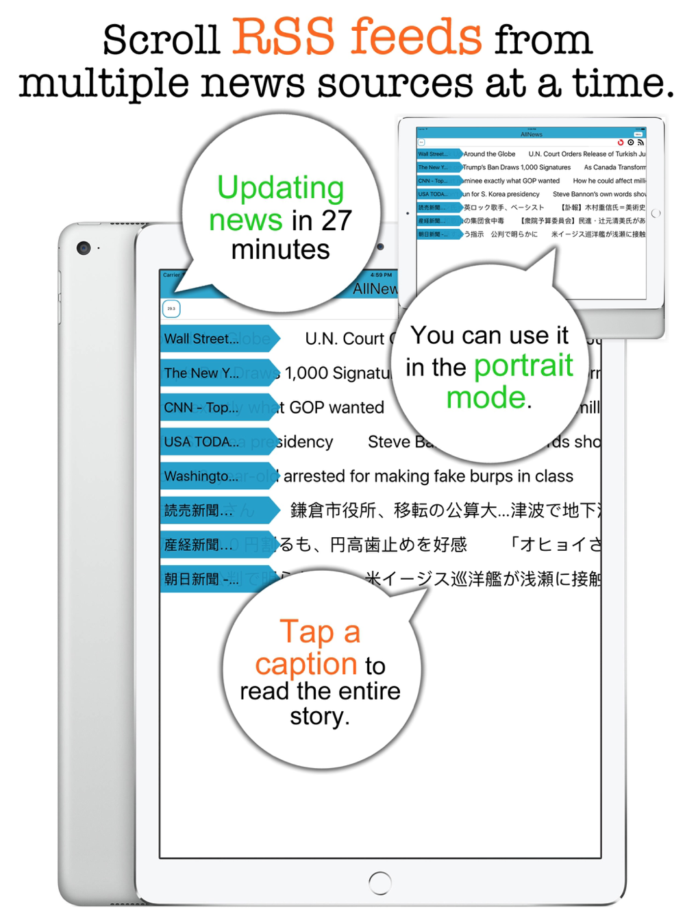 AllNews is a mobile app for iPhone and iPad users who would like to read multiple RSS news feeds at a time instead of visiting one news web site after another. With this app, you don't scroll a list of news captions. Even a teenager could make an app like that. Rather, AllNews will scroll each line of news captions for you. So just watch them and tap a news caption that catches your eyes so that you can read the entire story with a web browser. The app comes with a built-in library of 100+ RSS links. So just pick one or more and get lines of news captions rolling.
